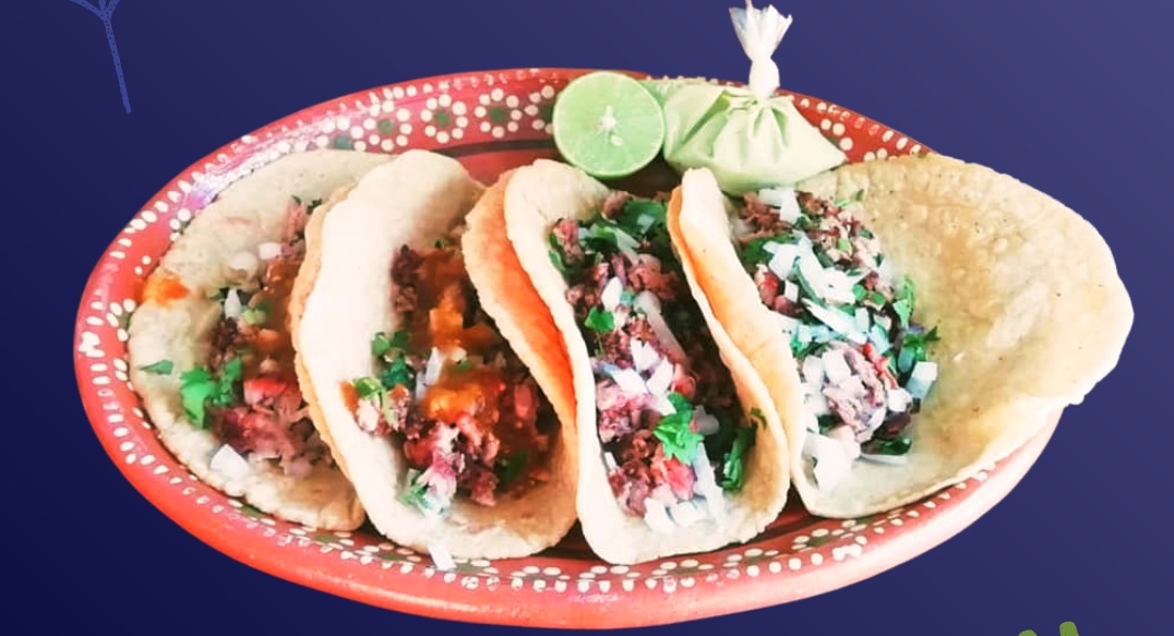 Tortilla echa a mano rellena de carne arrachera, verdura limones y salsas