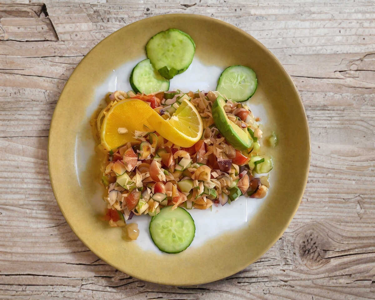 Camarón curtido, jitomate, cebolla, pepino, cilantro y chile serrano.