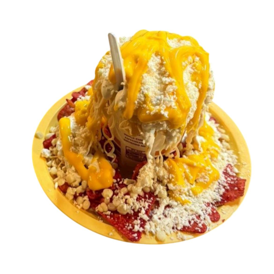 medio litro de esquite preparado con mayonesa, crema, semi seco y queso amarillo. Rodeada de sabritas tipo takis