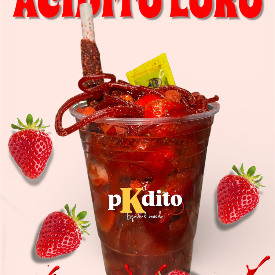 Fresas bañadas en chamoy, dulce de tamarindo, gomitas y skwinkles.