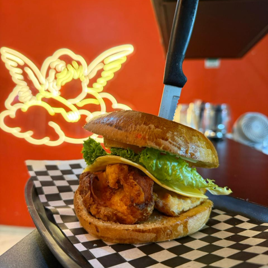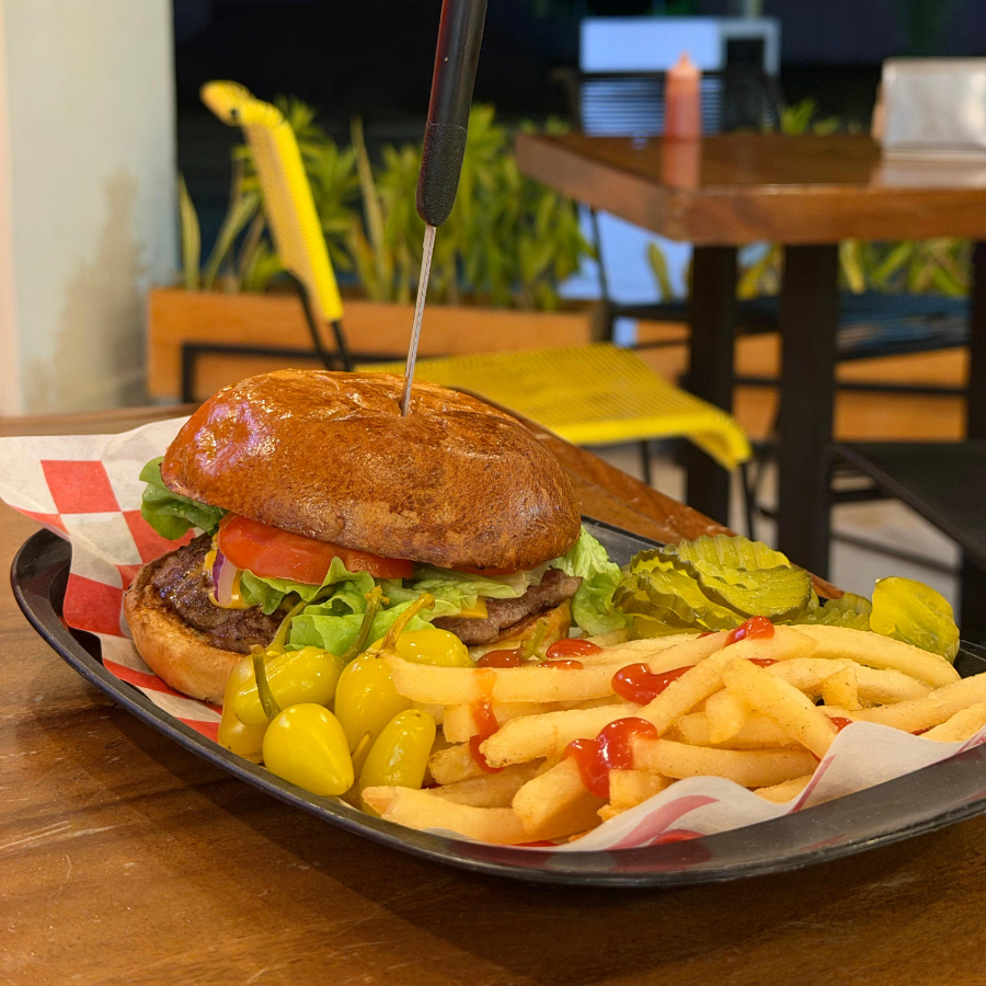 Pan artesanal con jugosa carne de res, queso amarillo y vegetales.