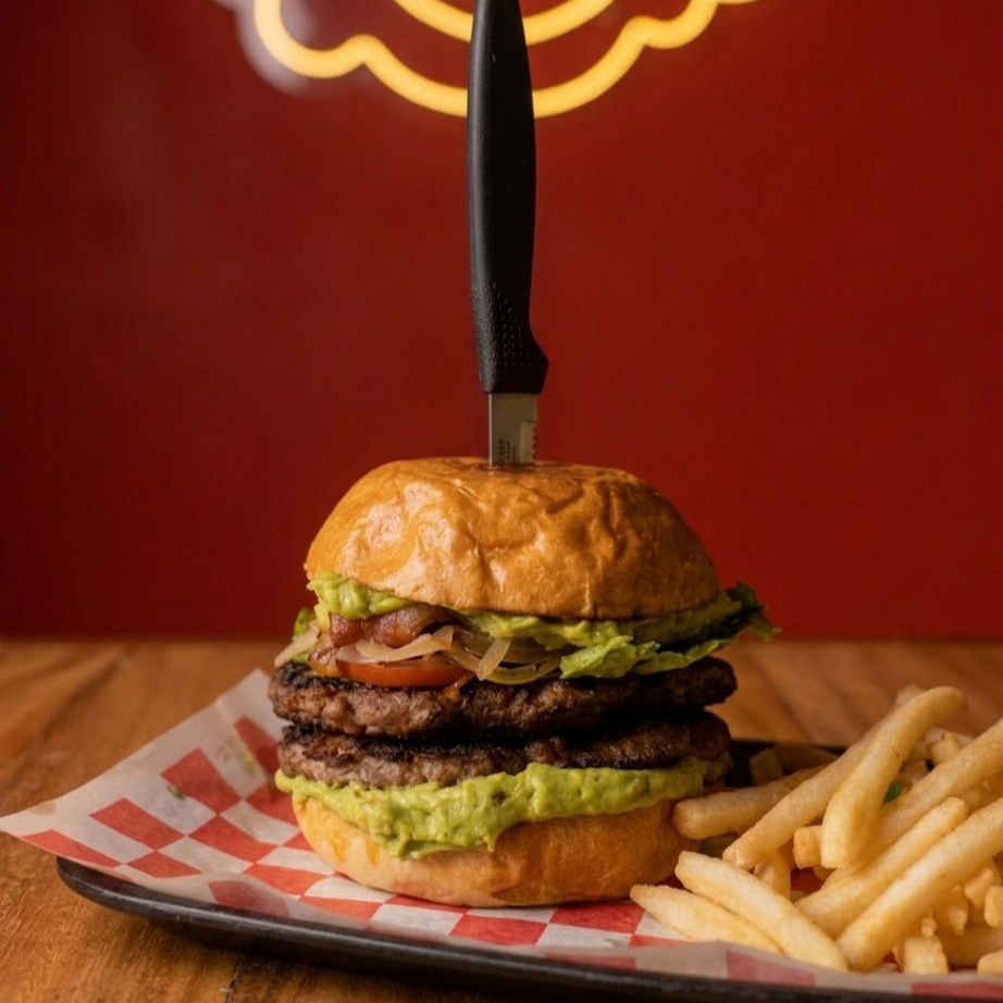 Nuestro pan artesanal, doble carne de res, queso amarillo, tocino, guacamole y vegetales.
