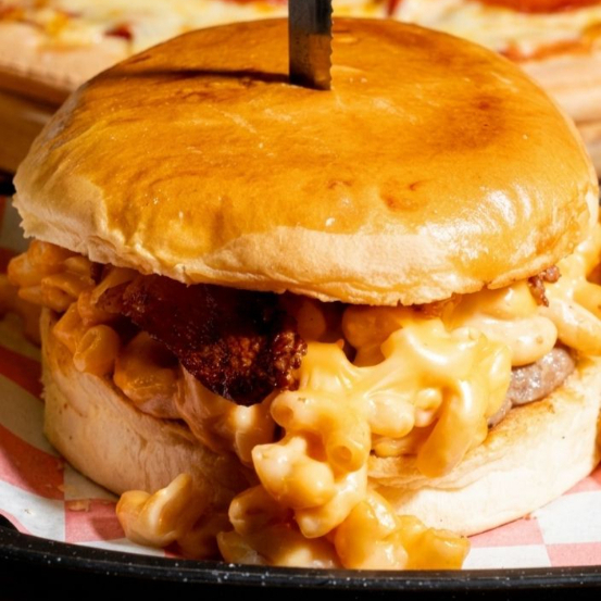 Nuestro pan artesanal, con jugosa carne de res, macarrones con queso y tocino.