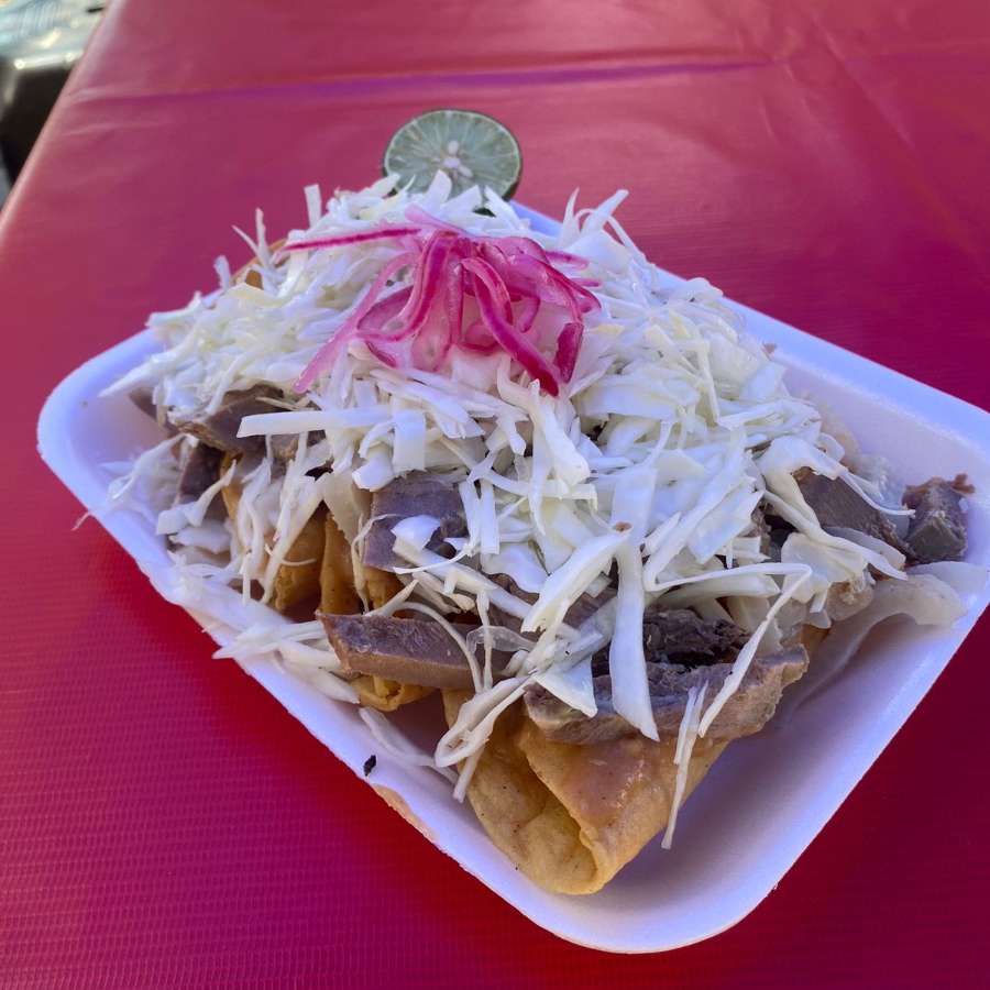 Orden de 4 Tacos dorados con Carne, frijol, verdura y delicioso consome.