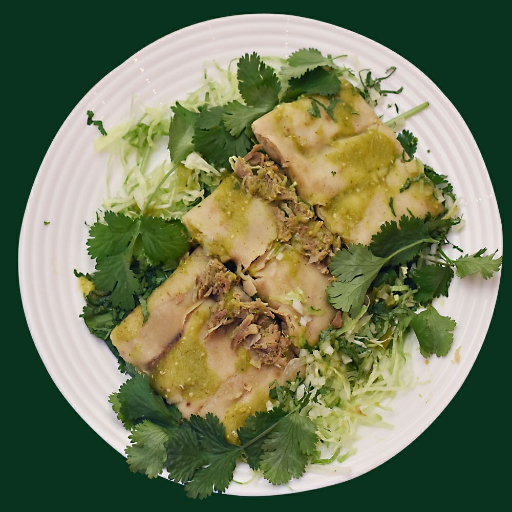 Taquito res vaporizado al grado de hacerse un tamalito, acompañados de Lechuga, Cebolla, Cilantro y sus ricas 2 Salsa (Sin chile y muy picosa)
