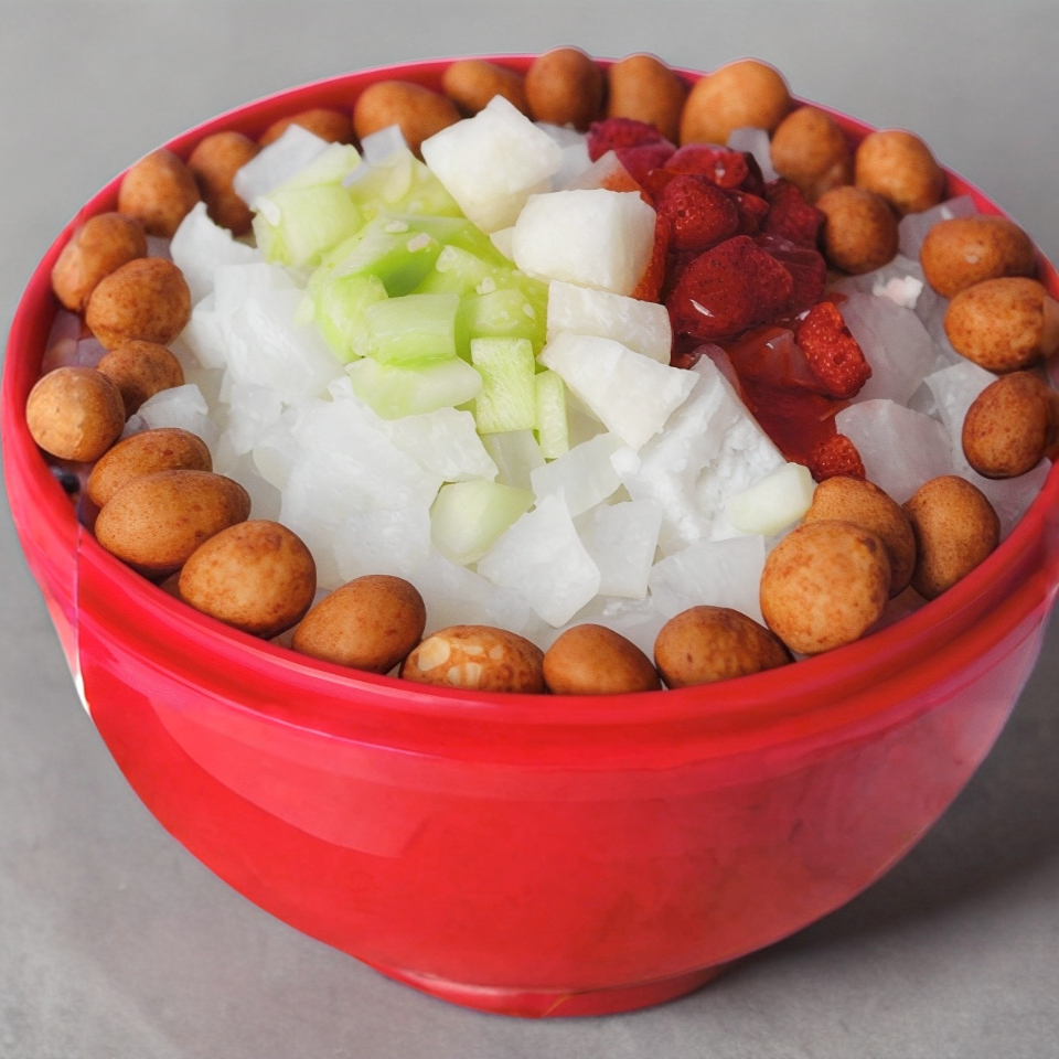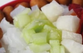 acompañado de jicama, pepino, cuero, cacahuate, goma y salchicha