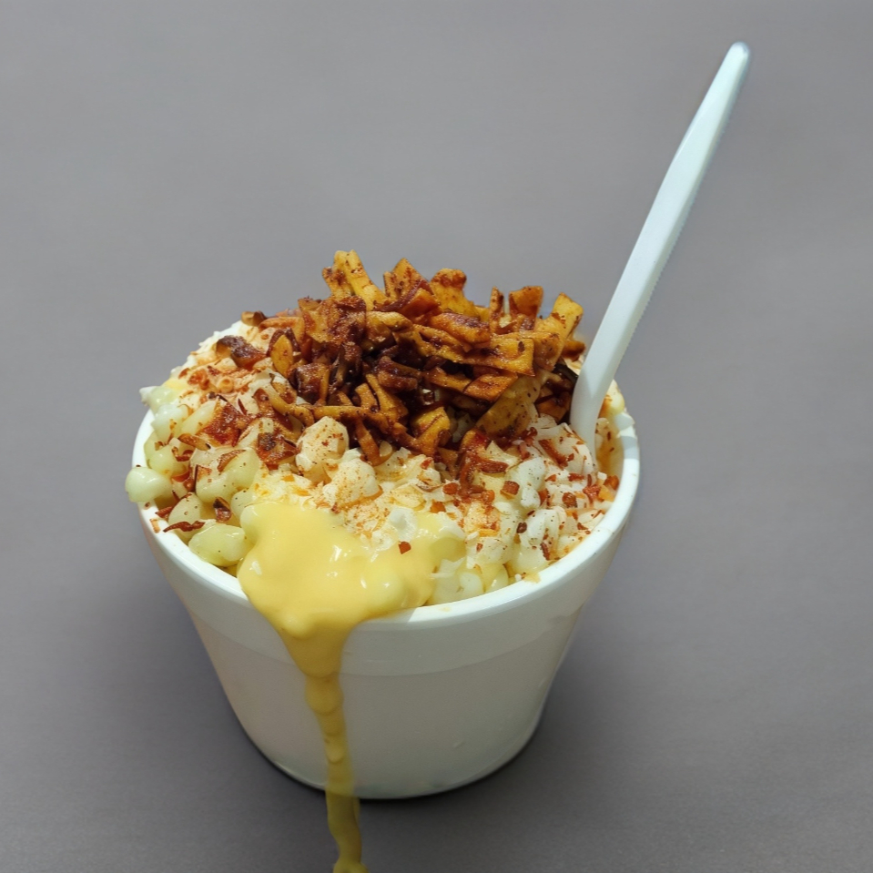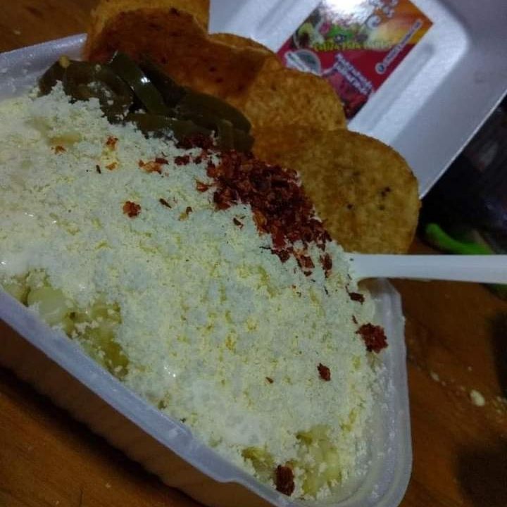 tostito con elote tiernito acompañado de crema o mayonesa queso chile y limón