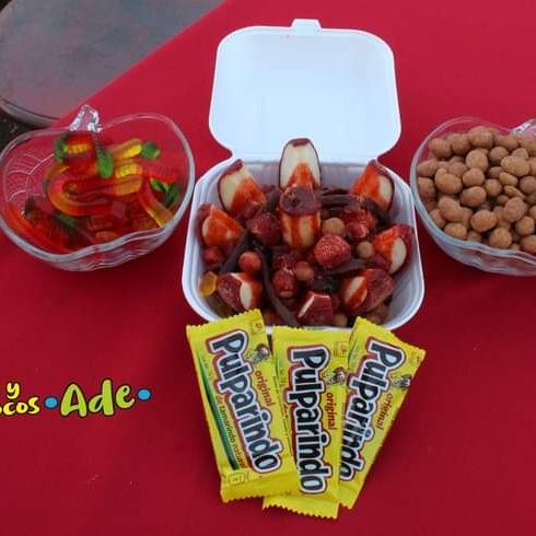 jicama, pepino, cacahuate, goma de mango, goma de lombriz, pulparindo y acompañada de chamoy, miguelito y limon