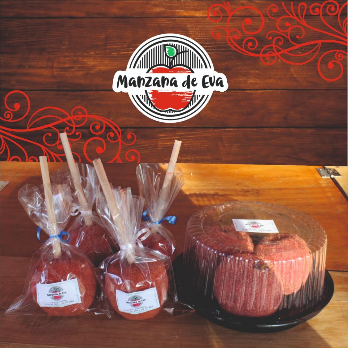 Manzana forrada con dulce de tamarindo y espolvoreada con miguelito acompañada con jicama, pepino, cacahuate, goma de lombriz, goma de mango, pulparindo, tamborcitos, chamoy, clamato y mas miguelito