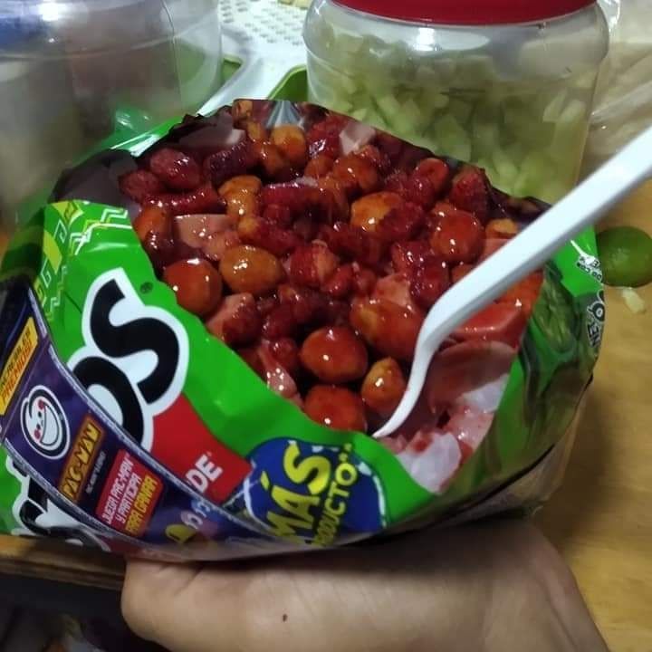 tostitos con jicama, pepino, cuero, cacahuate, goma de mango y salchicha acompañados con chamoy, salsa inglesa, maggie, chile y clamato