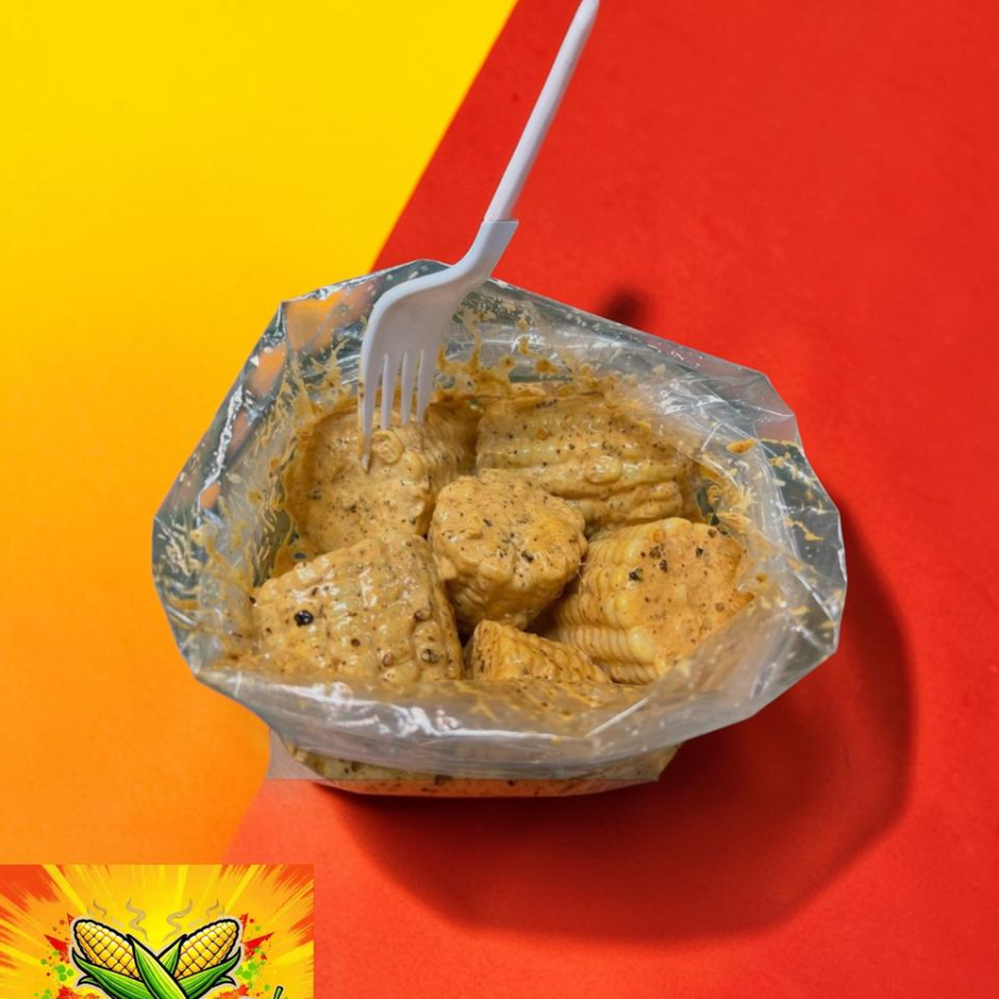 Trozos de elote revueltos con crema, mayonesa, chipotle, queso rallado, queso amarillo en bolsa, Porción de 2 elotes enteros.