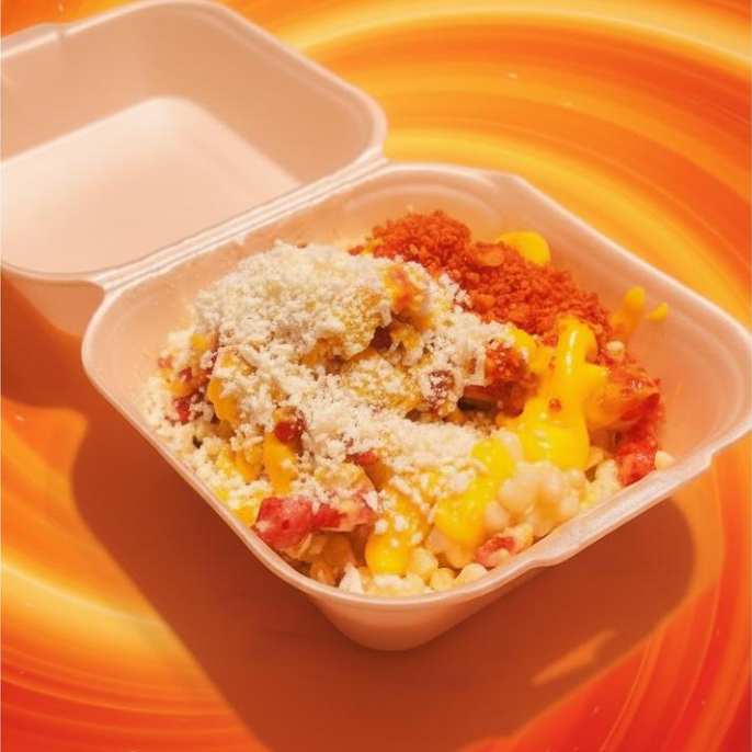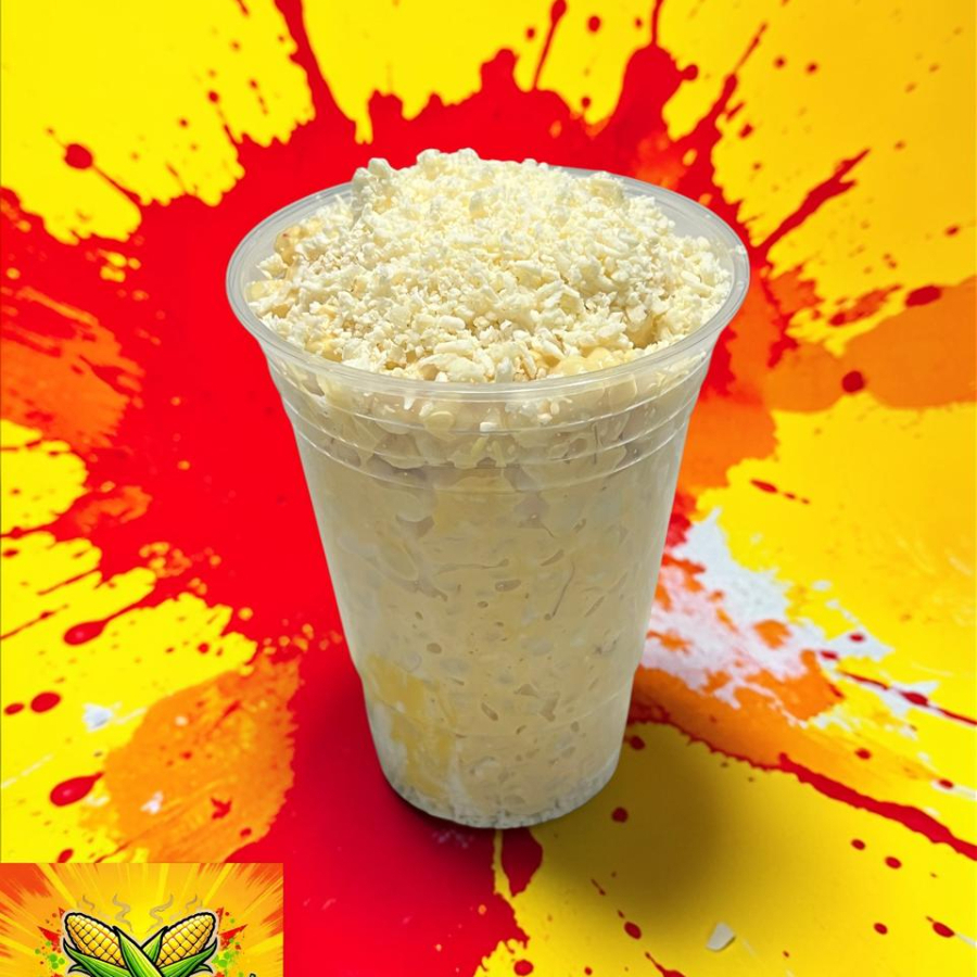 Granos de elote cocidos con crema, mayonesa, queso rallado, queso amarillo, limón.