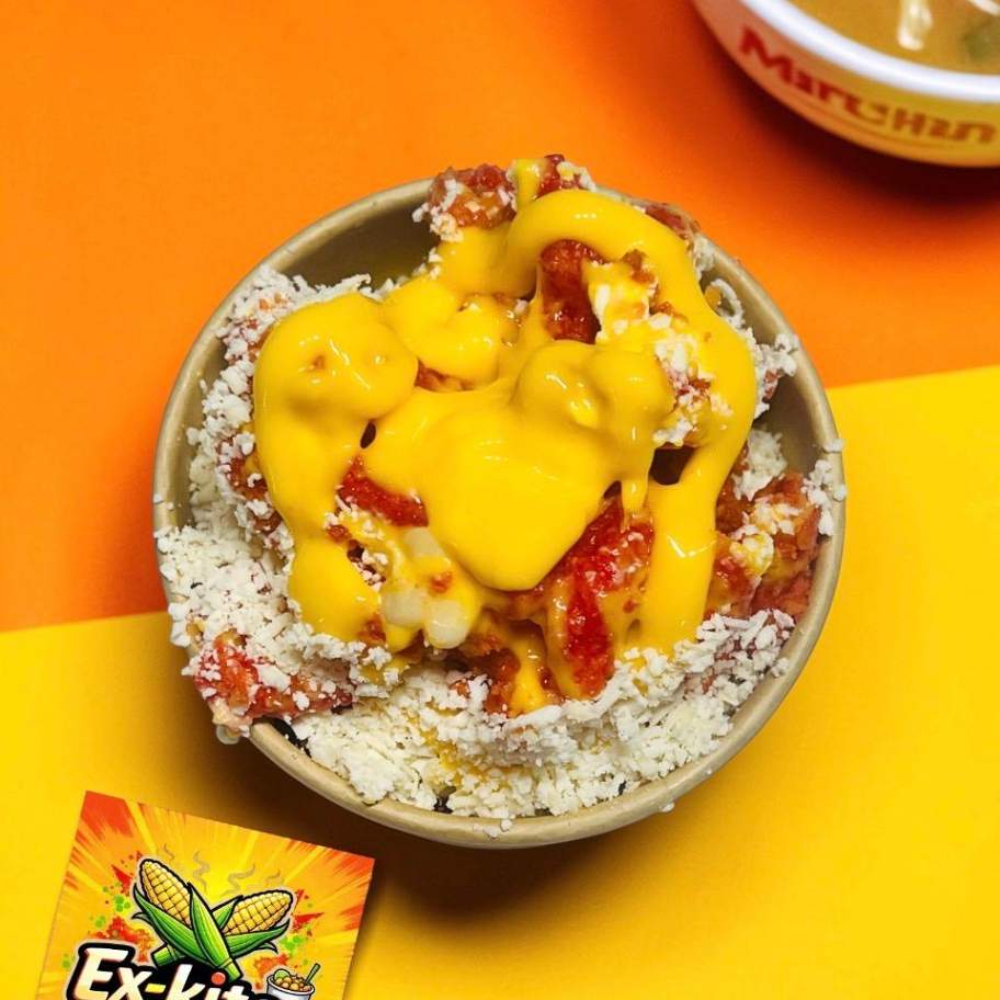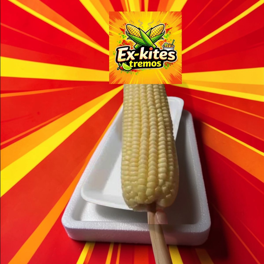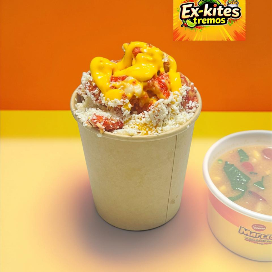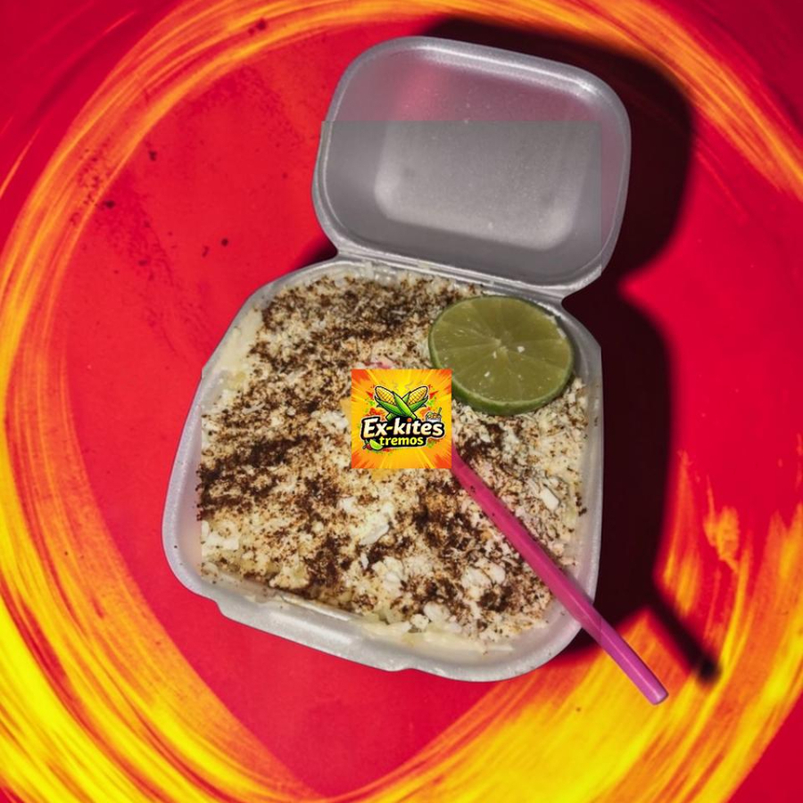 Granos de elote cocido con crema, mayonesa, queso rallado, queso amarillo, sabritas enteras y polvo sobre el EXKite.