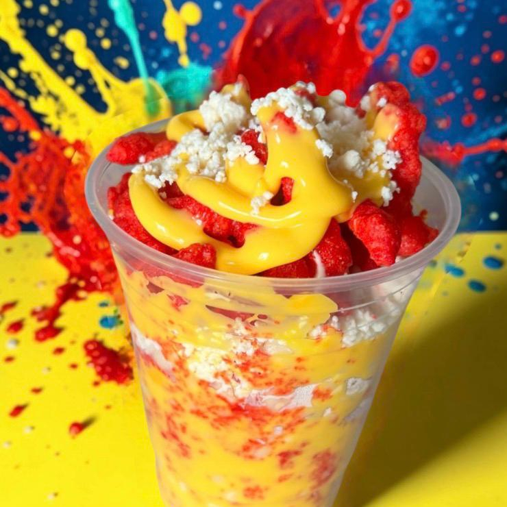 Deliciosa Maruchan con granos de elote cocido con crema, mayonesa, queso rallado, queso amarillo con sabritas en polvo.