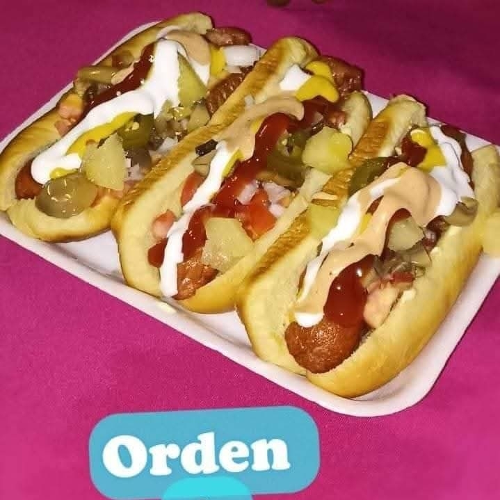 salchicha, jitomate, cebollla, crema, mayonesa, capsu.
