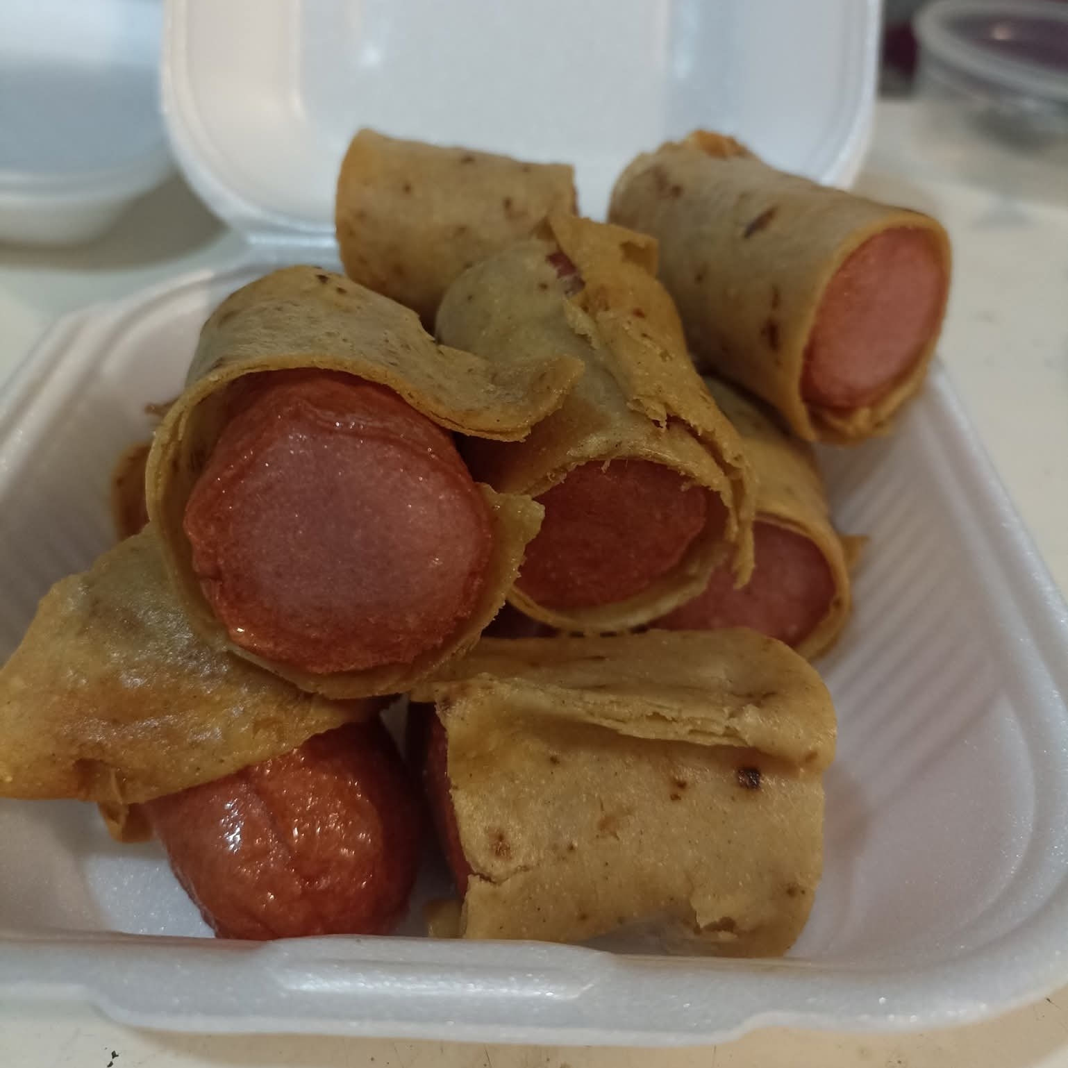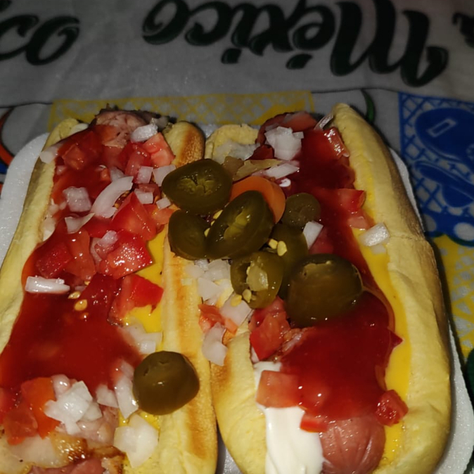 salchicha con tocino, jitomate, cebolla, crema, mayonesa, mostaza, capsu.