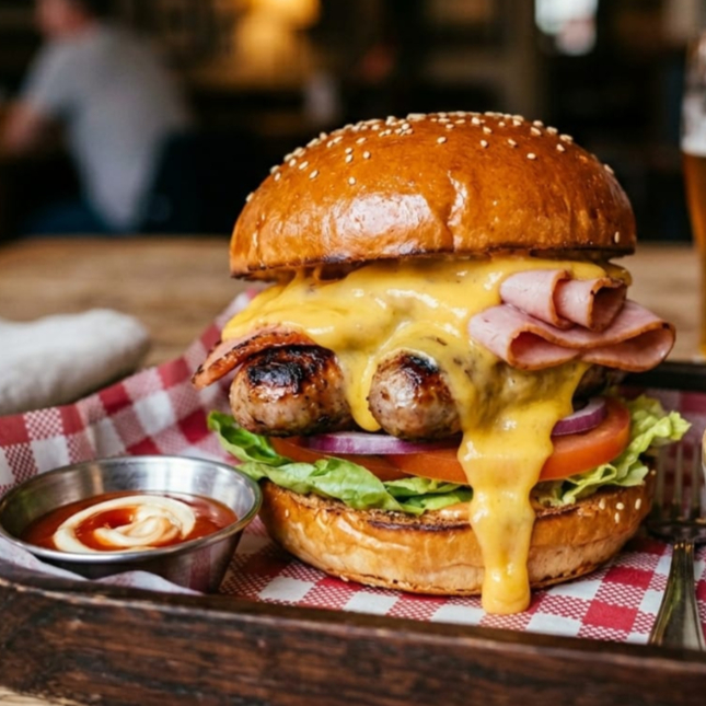 Carne de res, jamón, tocino, queso amarillo, jitomate, cebolla, chiles, crema, mayonesa, capsu.