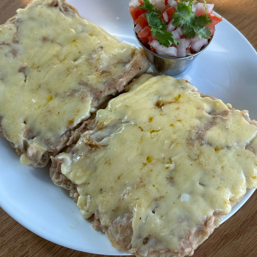 Telera con frijoles fritos, capa de queso gratinado y salsa mexicana.