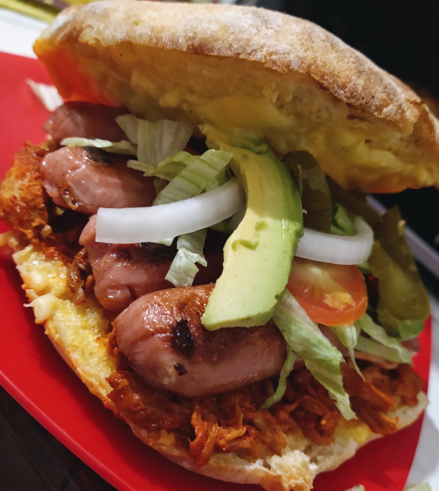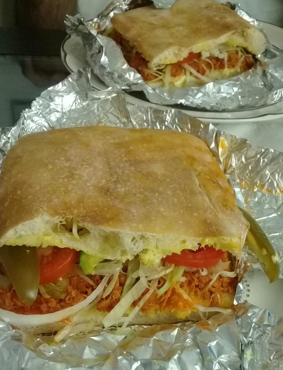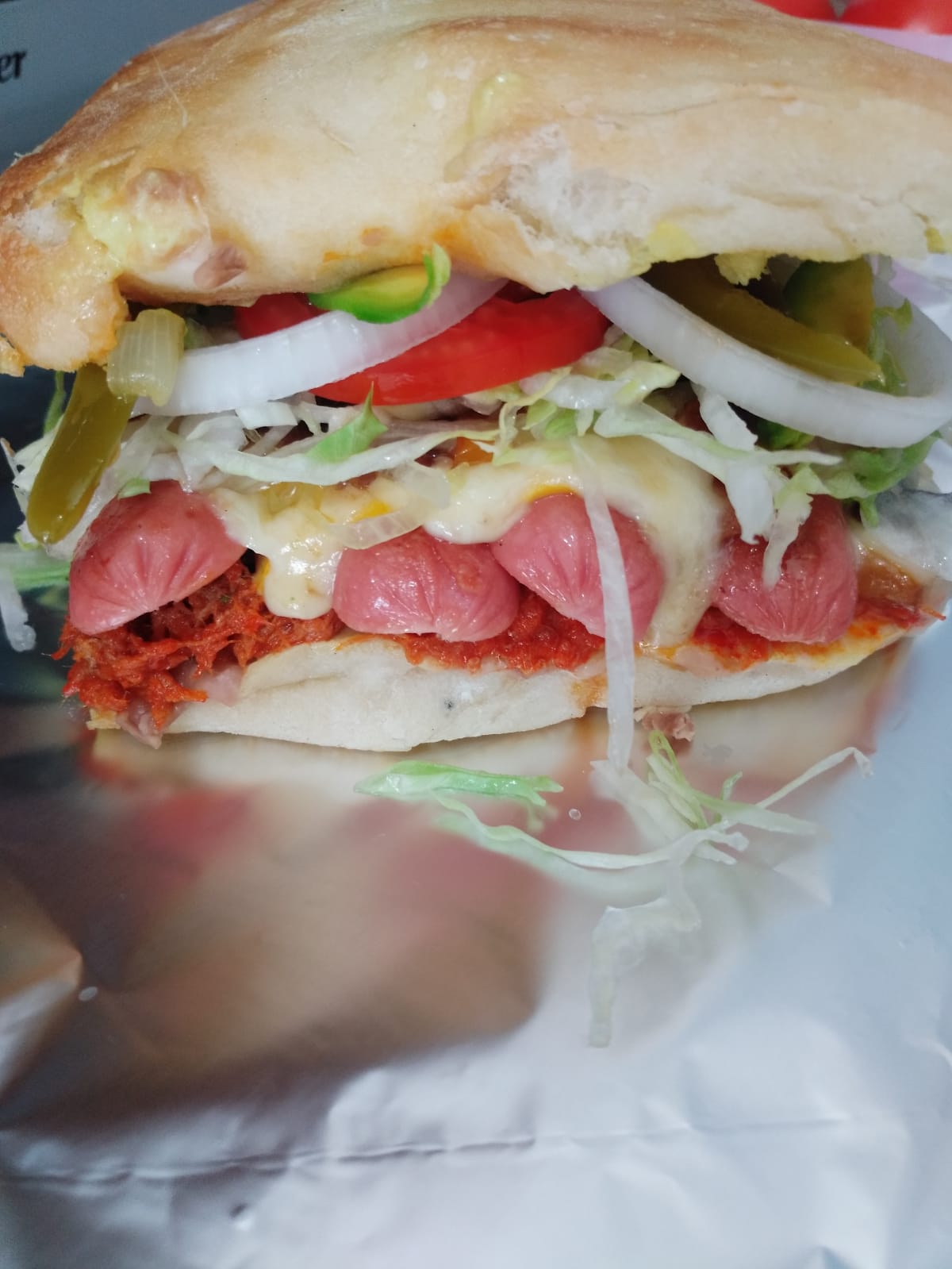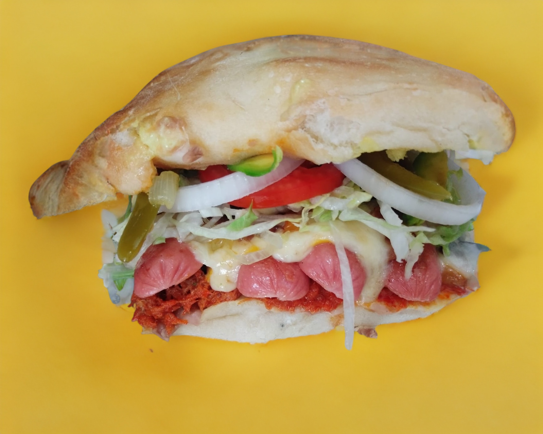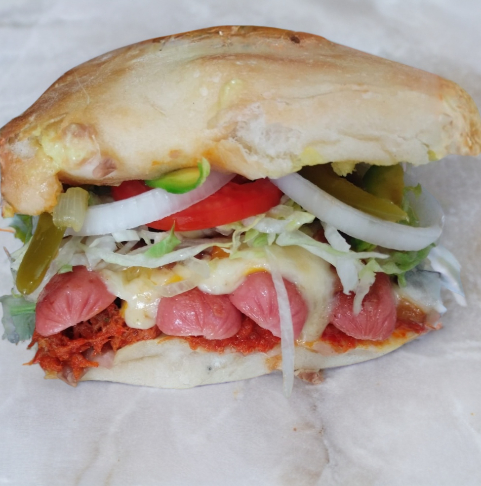 Telera jumbo con lomo adobado, salchicha, jamón, queso mozarella queso amarillo