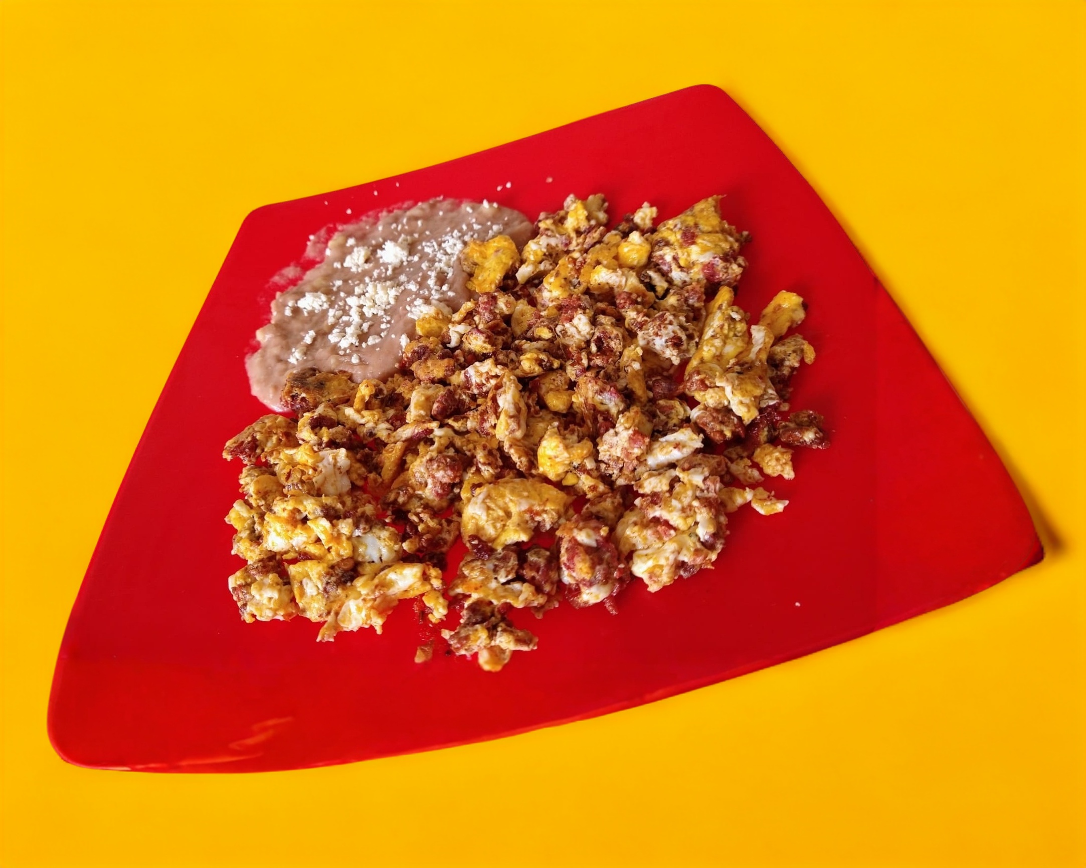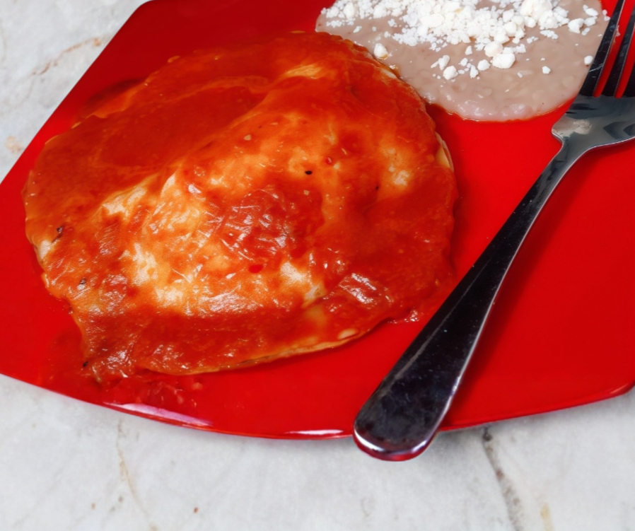 2 Huevos estrellados bañados en salsa roja sobre 2 tortillas doradas y frijoles.