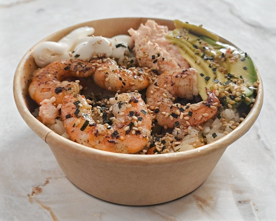 Arroz frito, camarones, calabacita, zanahoria, aguacate, Philadelphia, Tampico y cebollín