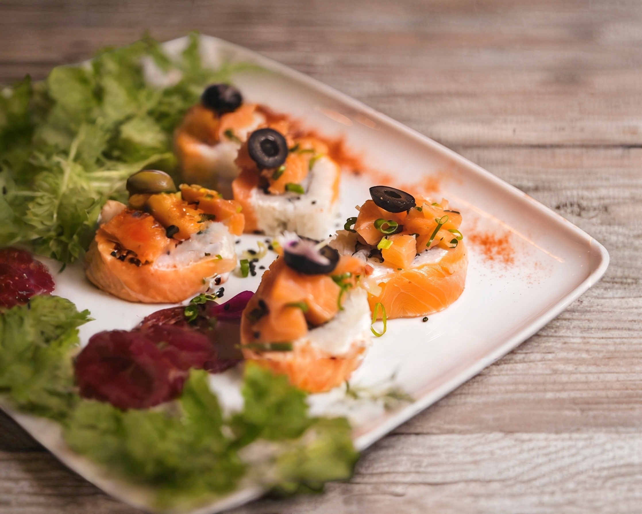 Pepino por dentro, envuelto en salmón flameado, coronado con Salmon, cebollín y aceituna negra.
