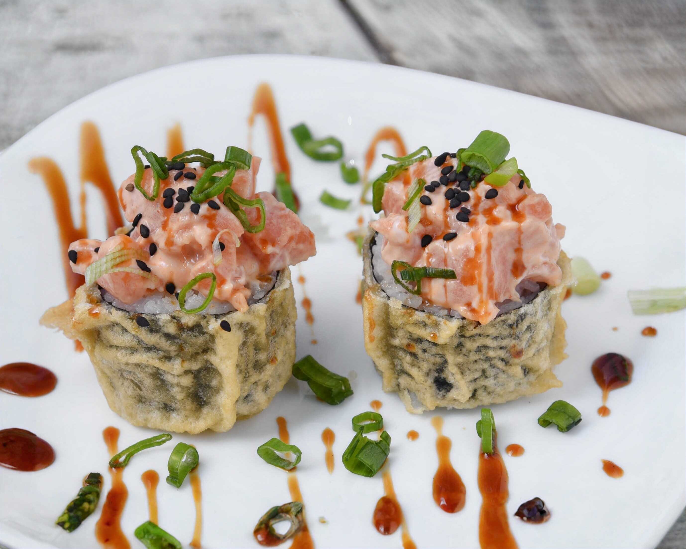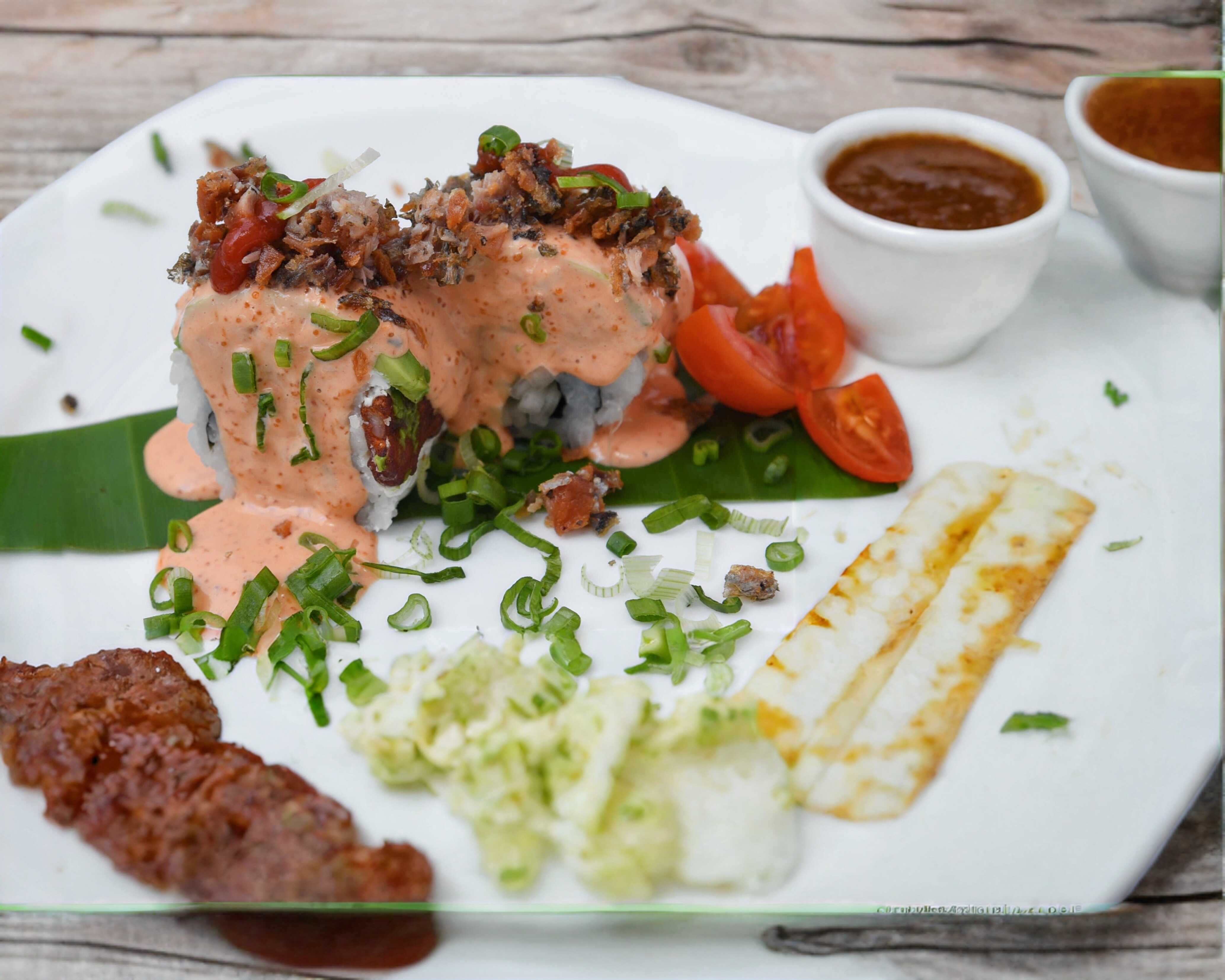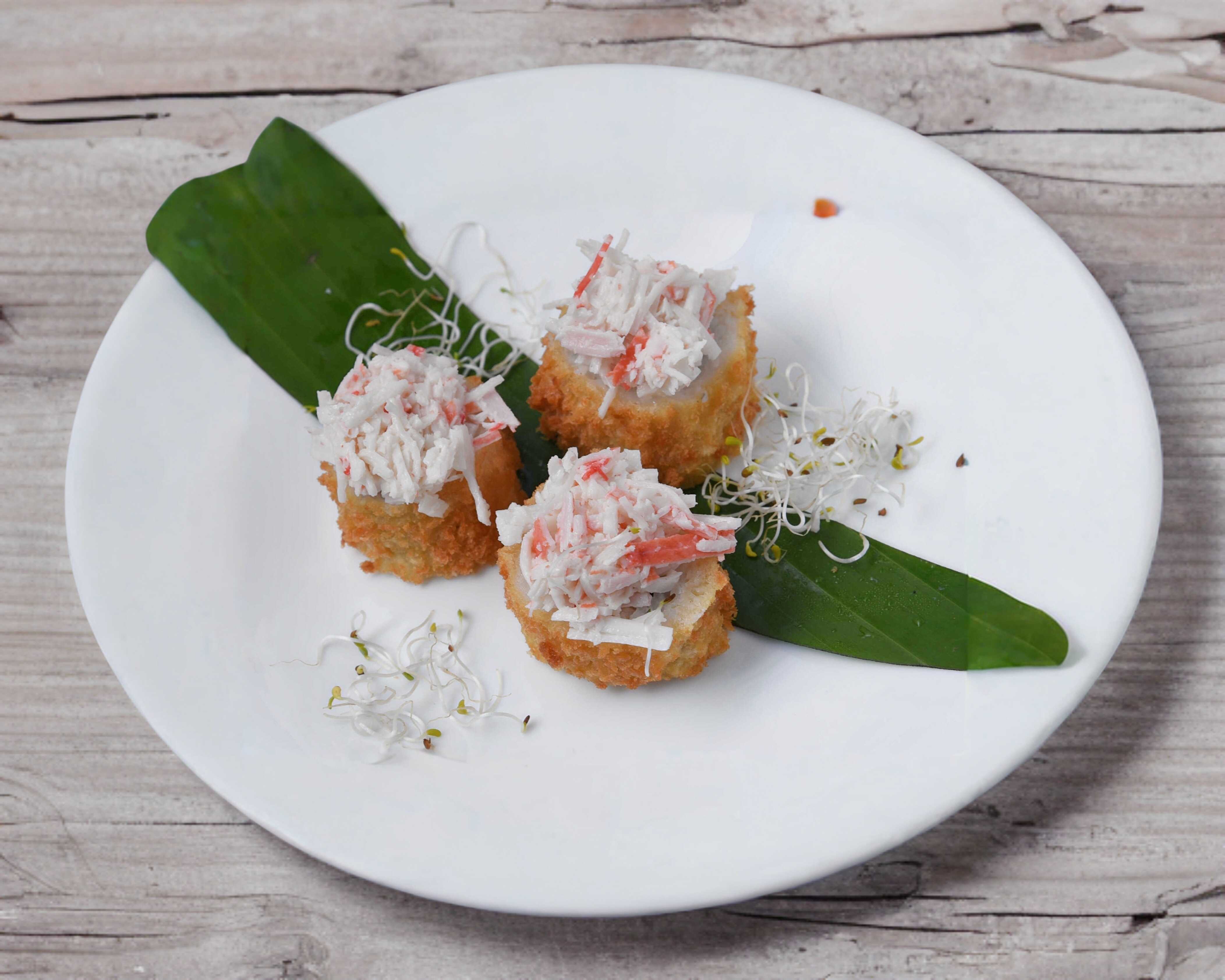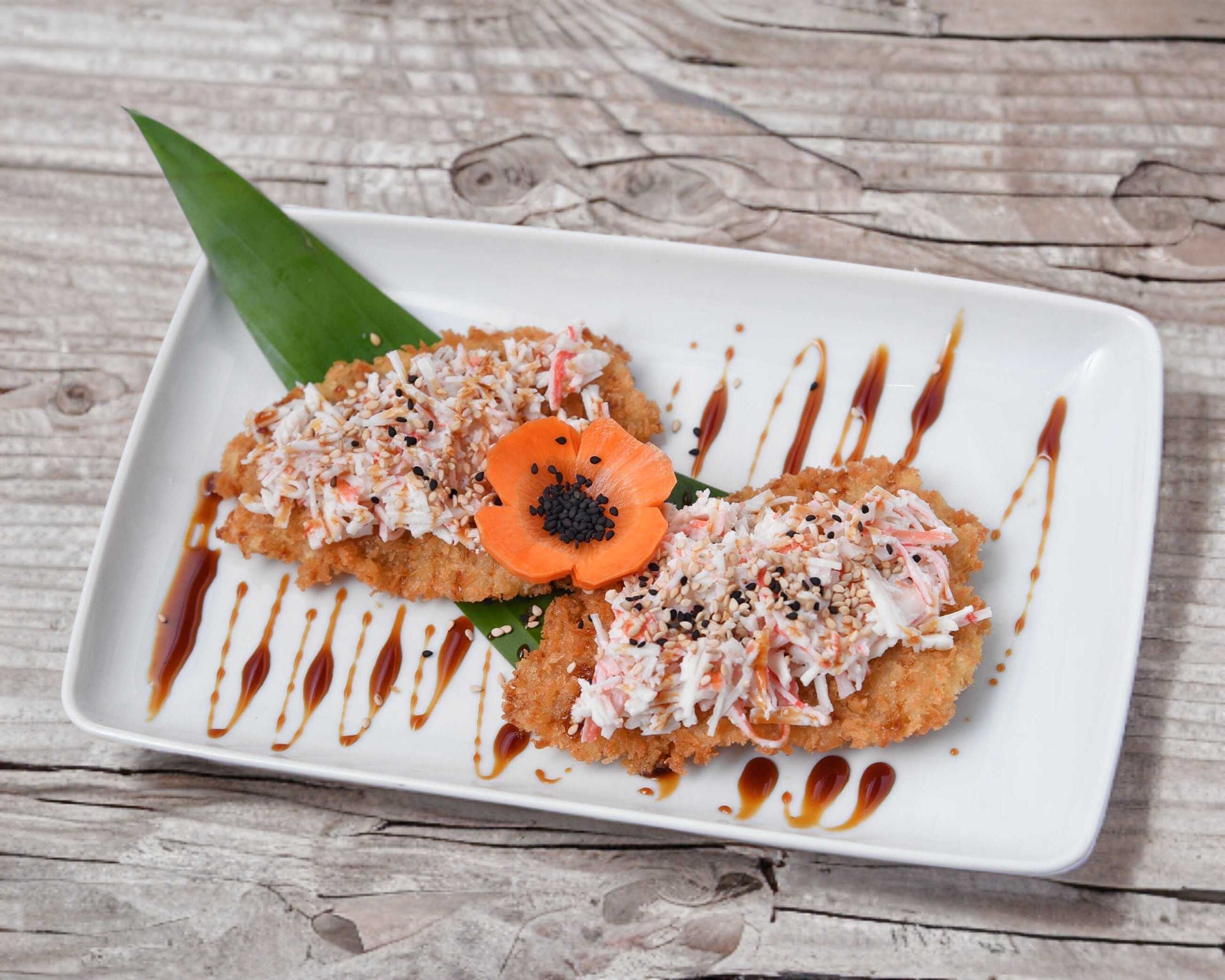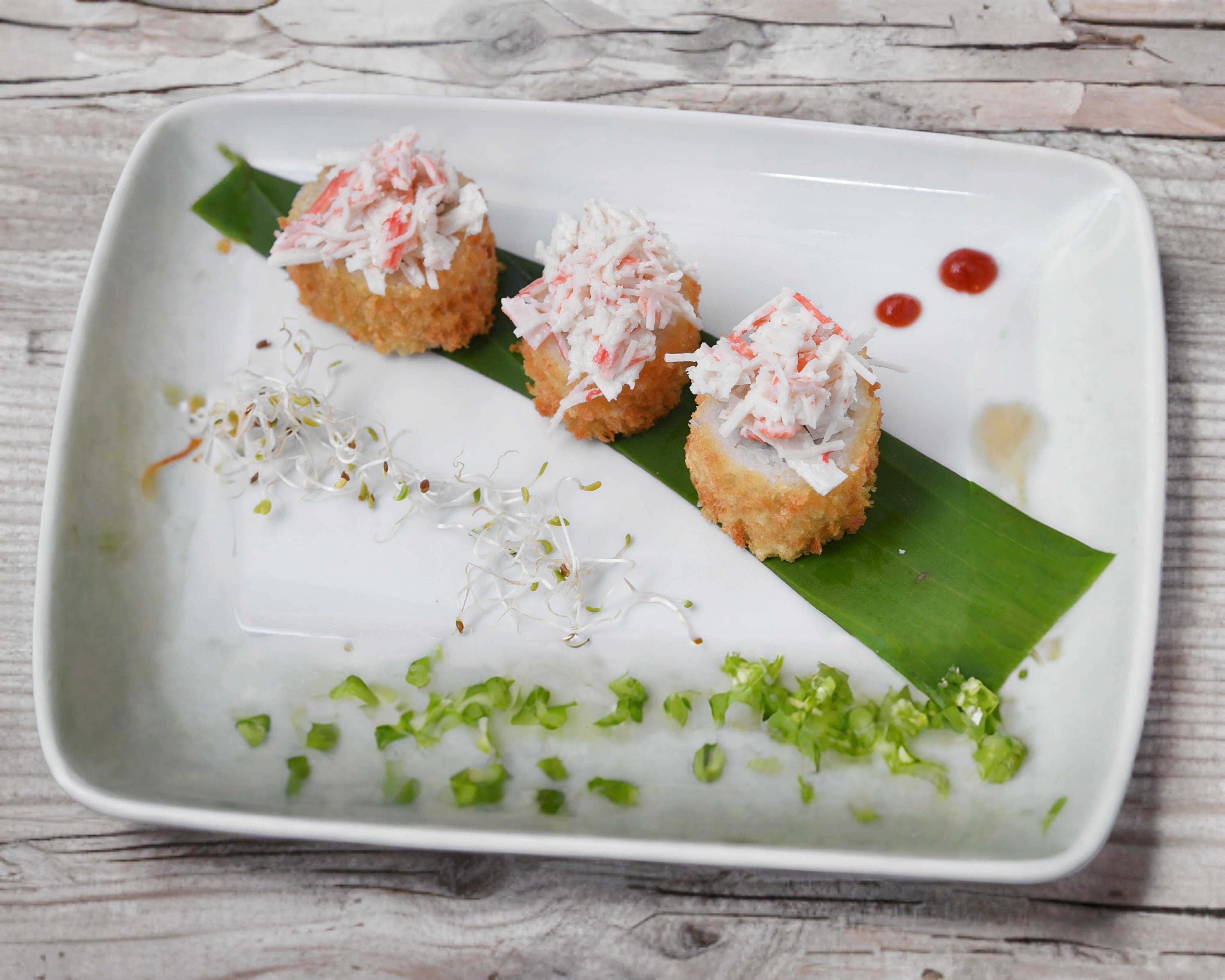 Salmón y surimi al centro, alga empanizada por fuera, coronada con chicharrón de pescado con salsa de la casa.