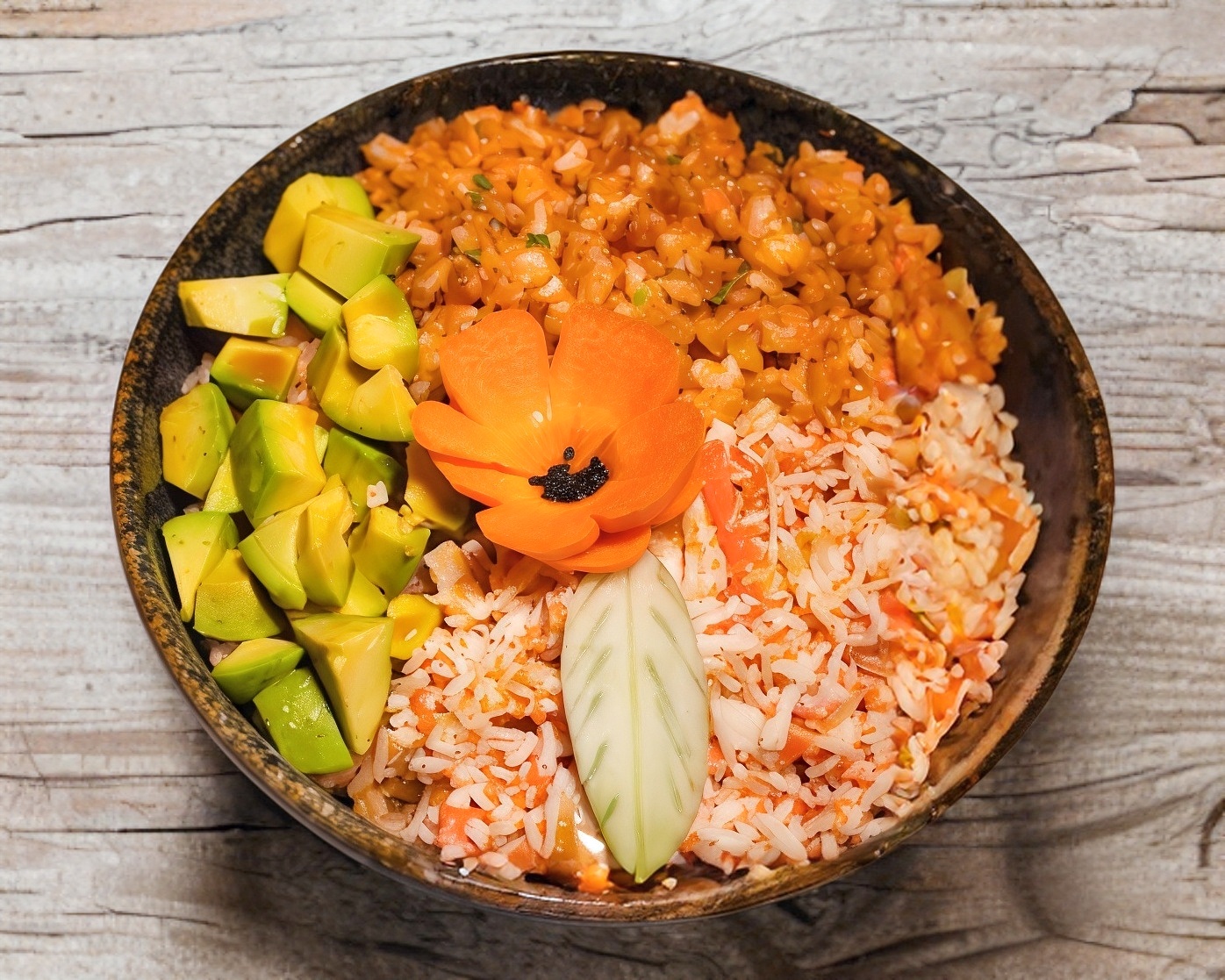 Arroz frito con verduras, aguacate, philadelphia y ensalada kani.