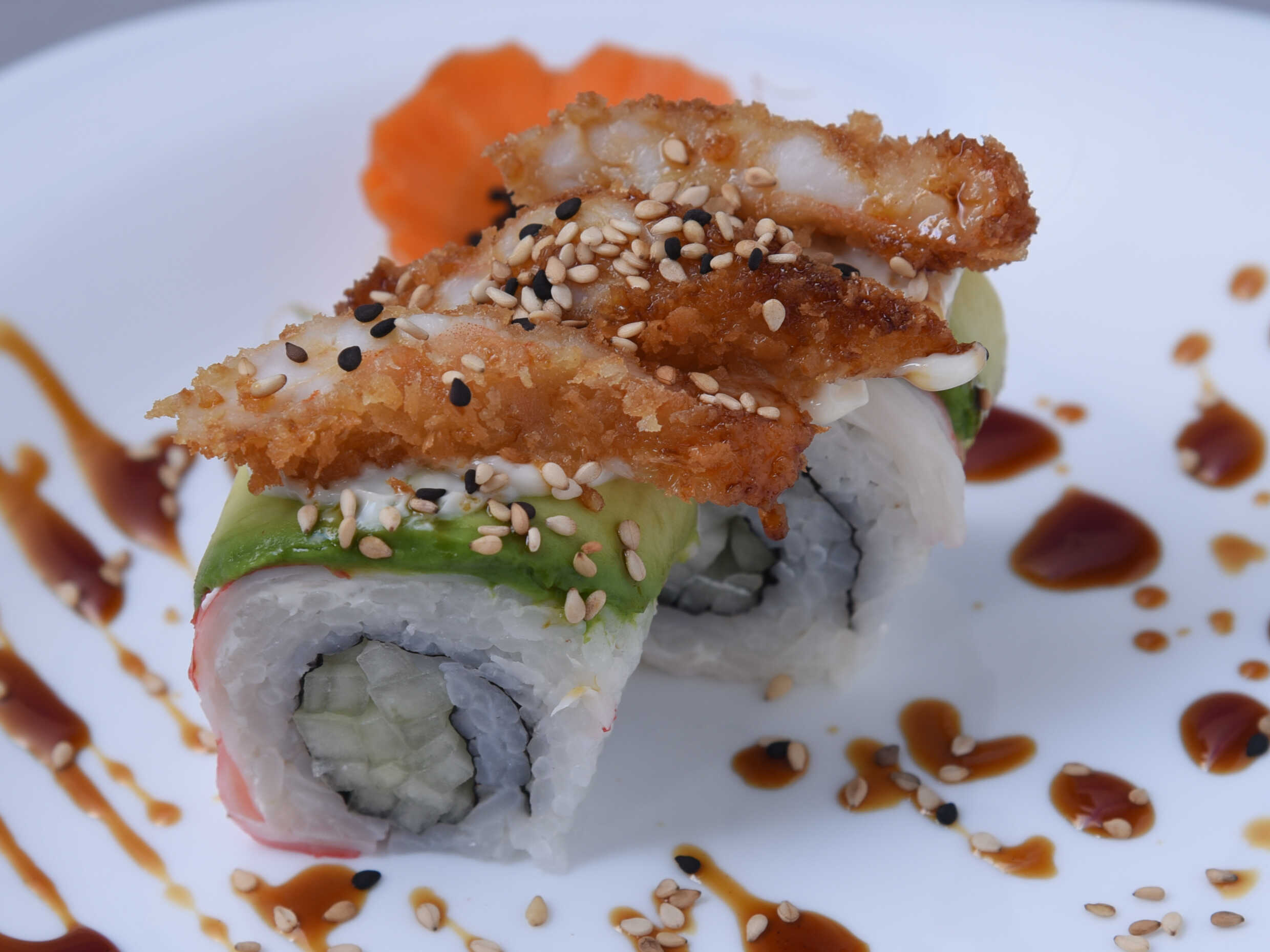 Aguacate y kani por dentro, coronado con aderezo de la casa y camarón empanizado.