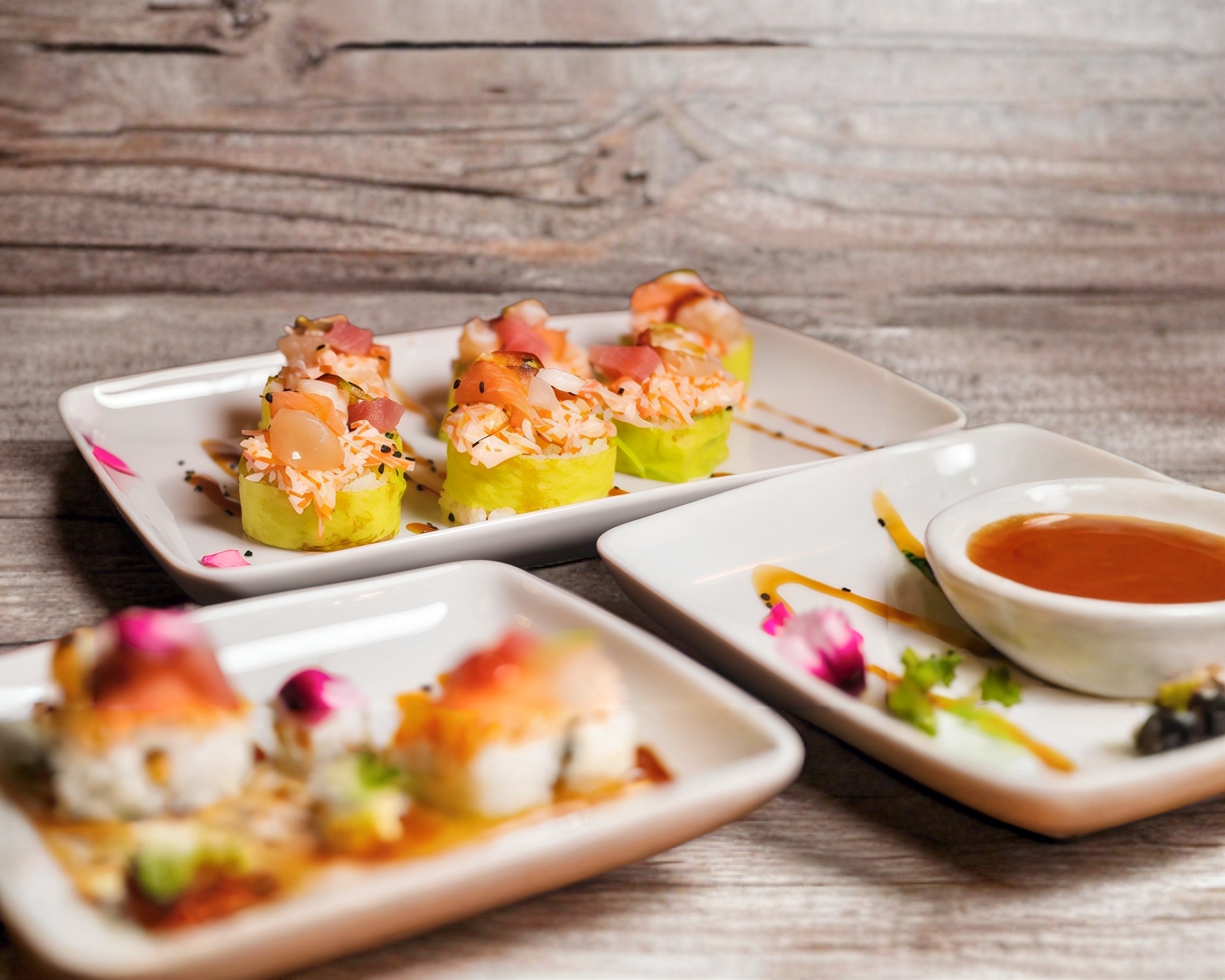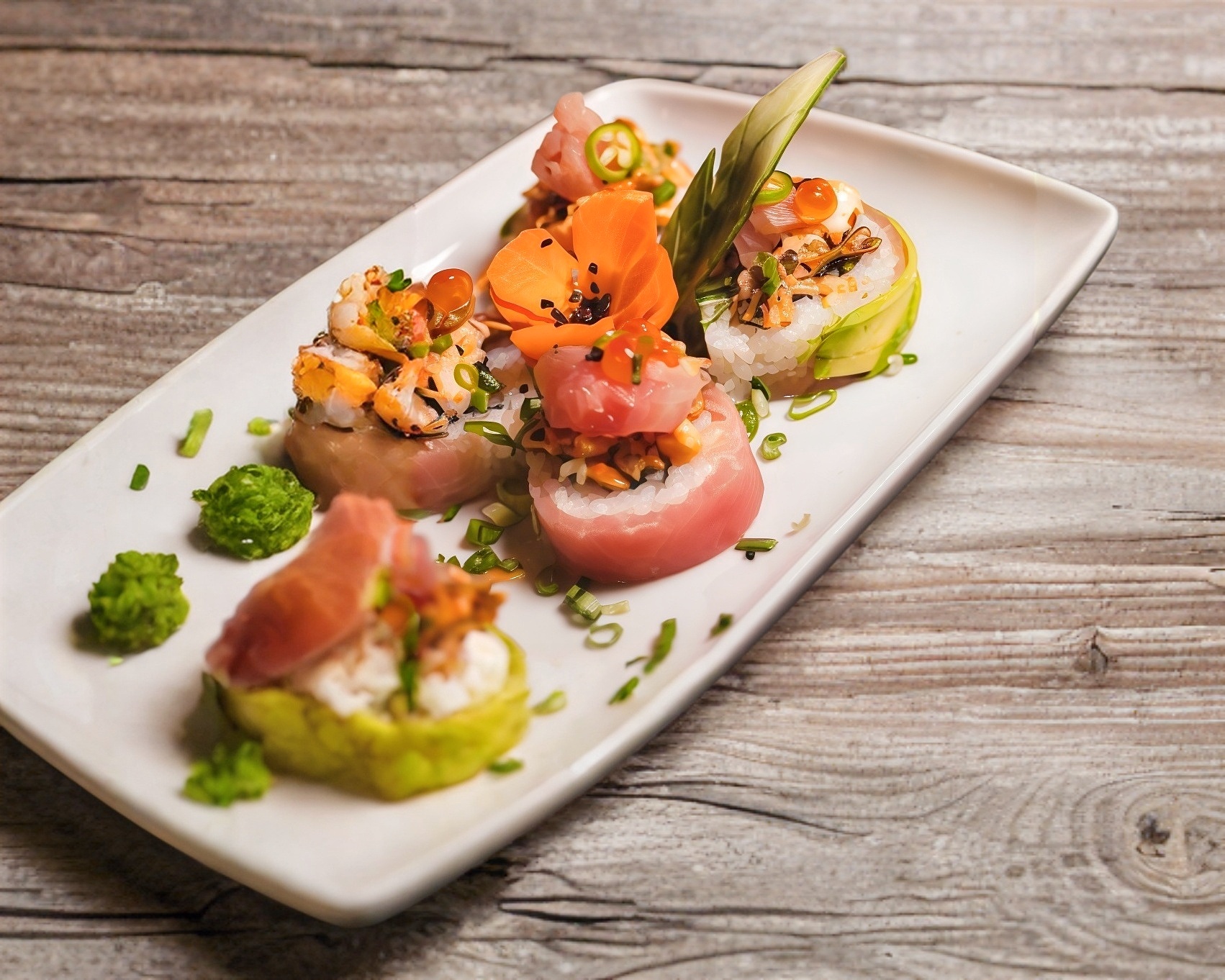 camarón empanizado, aguacate y philadelphia por dentro, topping ensalada de pulpo atún, salmón y callo con twist de limón.
