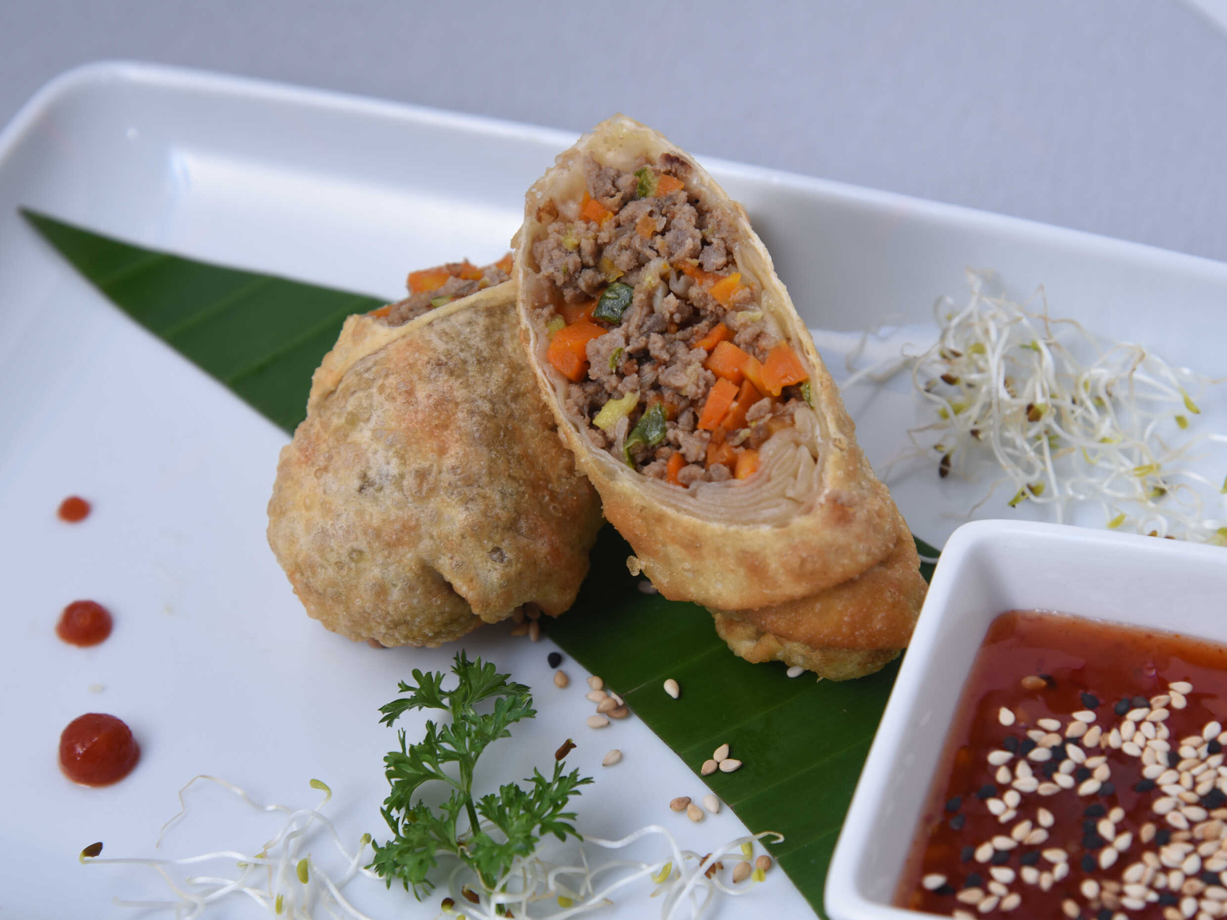 Envuelto crocante de guisado de res y vegetales con salsa thai, (2 Pz).