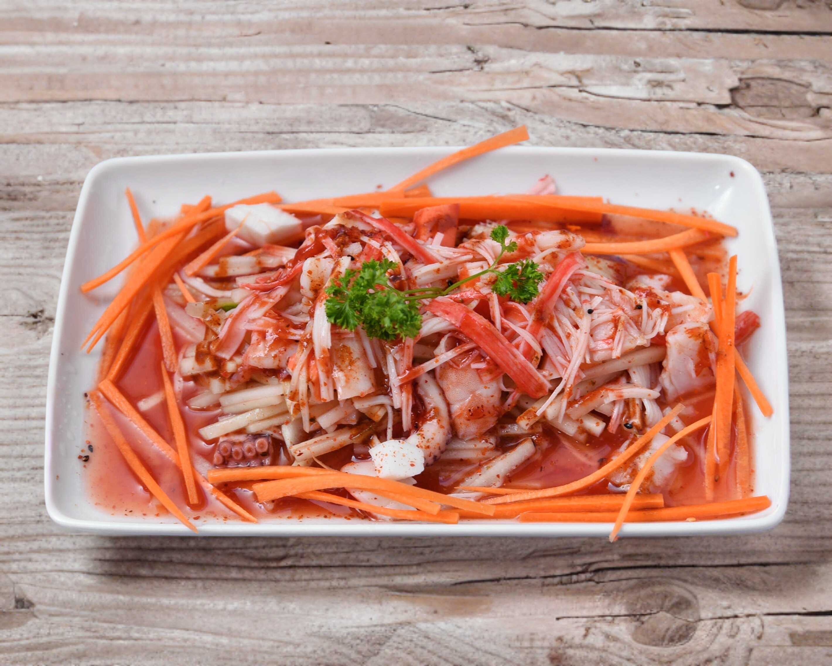 Mezcla de pepino con camarón, surimi, cangrejo y pulpo, con mezclas picositas orientales, (350 gr.).
