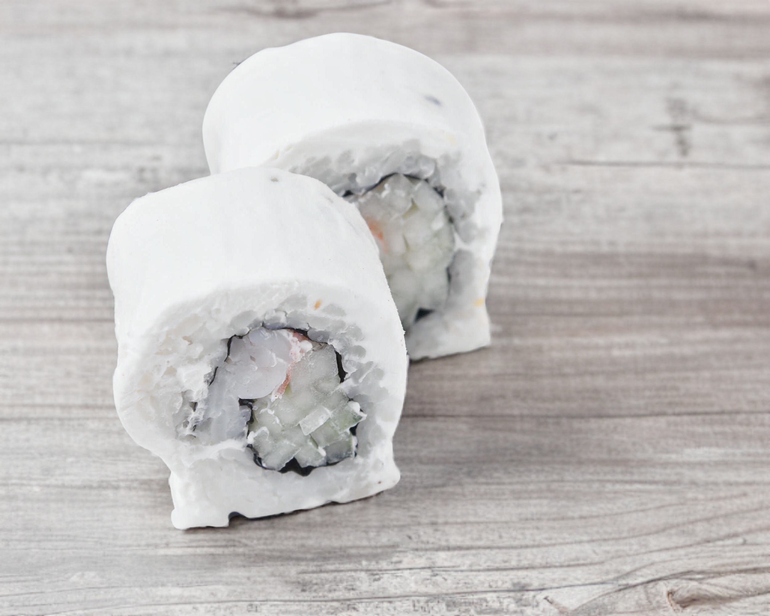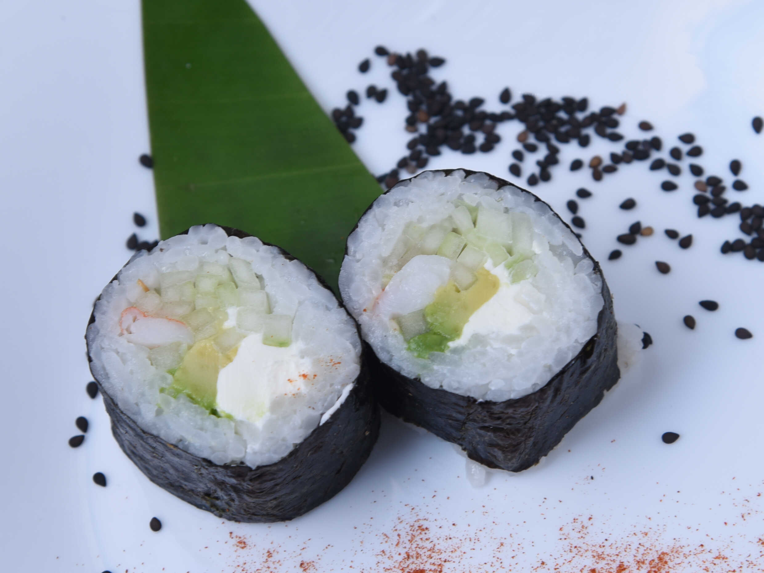 Pepino, alga, aguacate y camarón por dentro, envuelto en queso philadelphia.