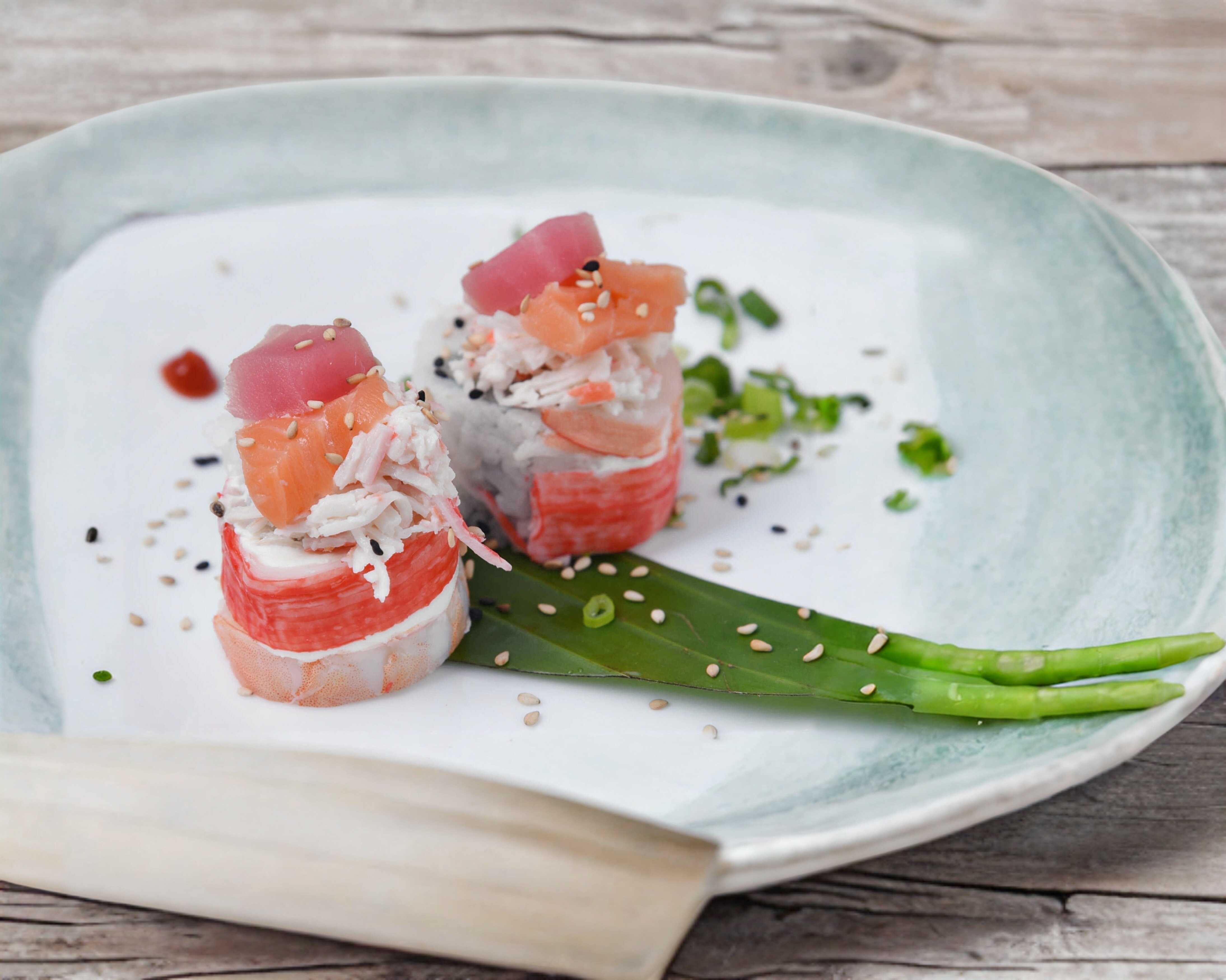 Pepino por dentro, envuelto en camarón y cani coronado con ensalada kani, trozos de atún, salmón y punto sriracha.