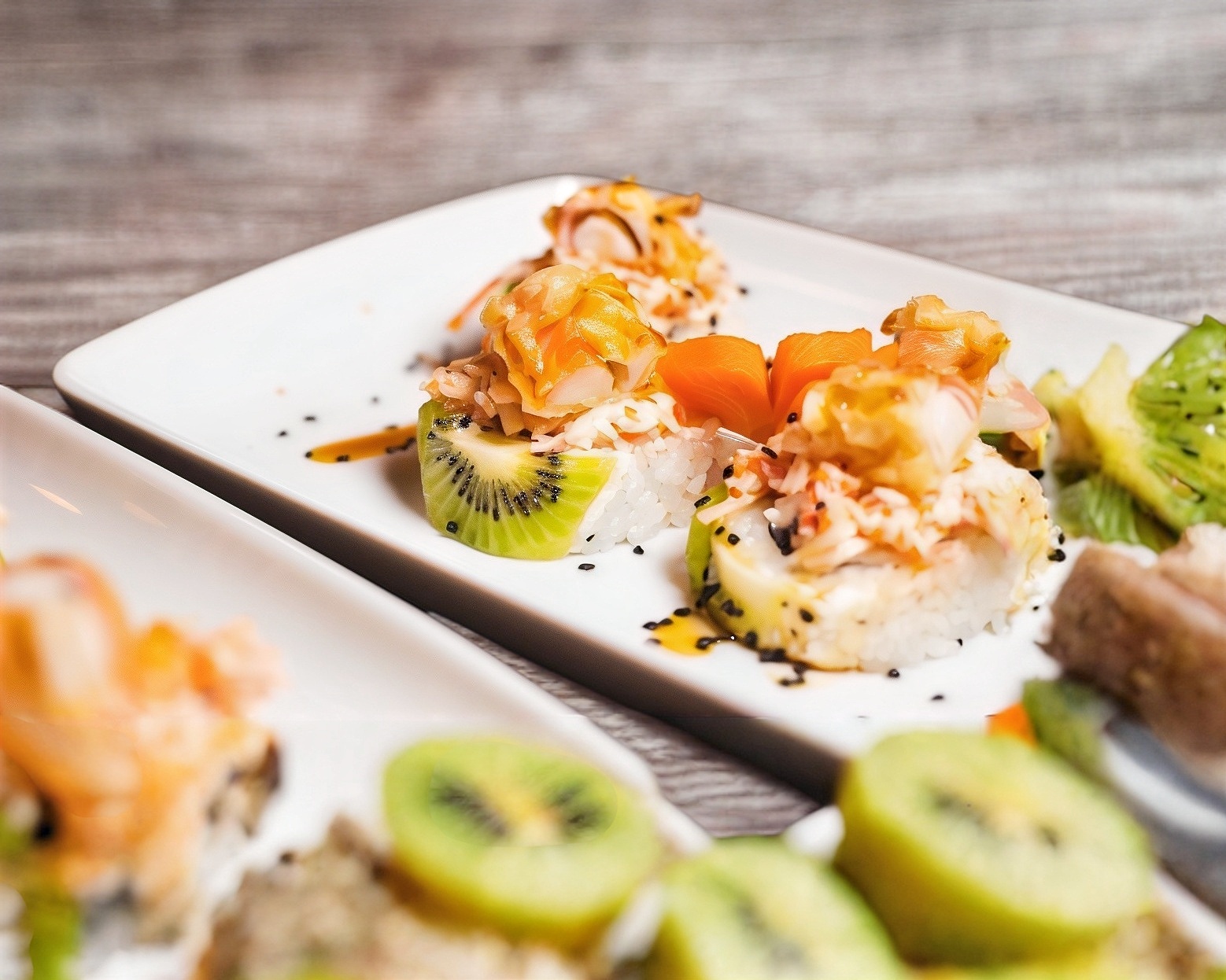 Envuelto en kiwi, atún y plátano al centro, coronado con ensalada kani y trozo de kani capeado.