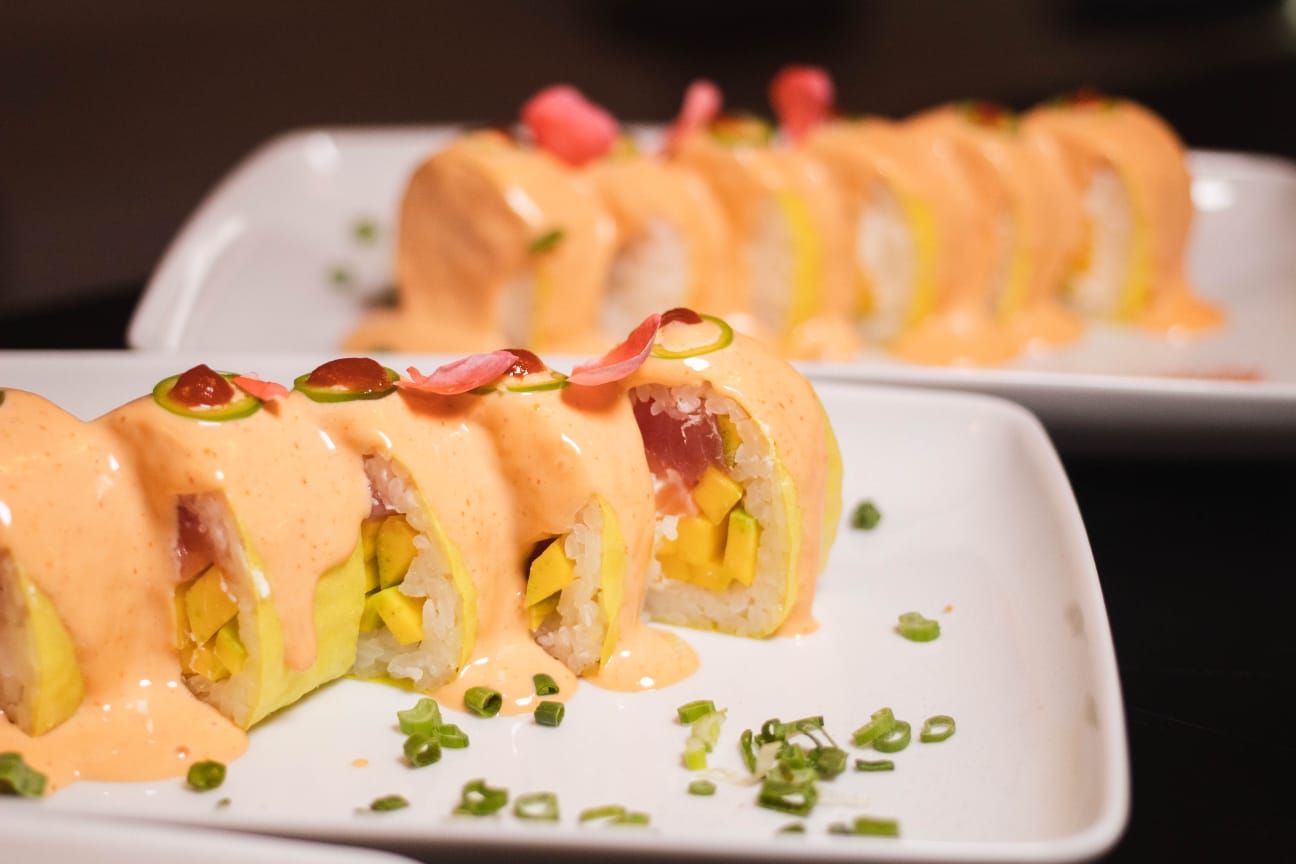 philadelphia, mango, atún y salmón, por dentro bañado en alga de soya bañado en aderezo spicy coronado con chile serrano.
