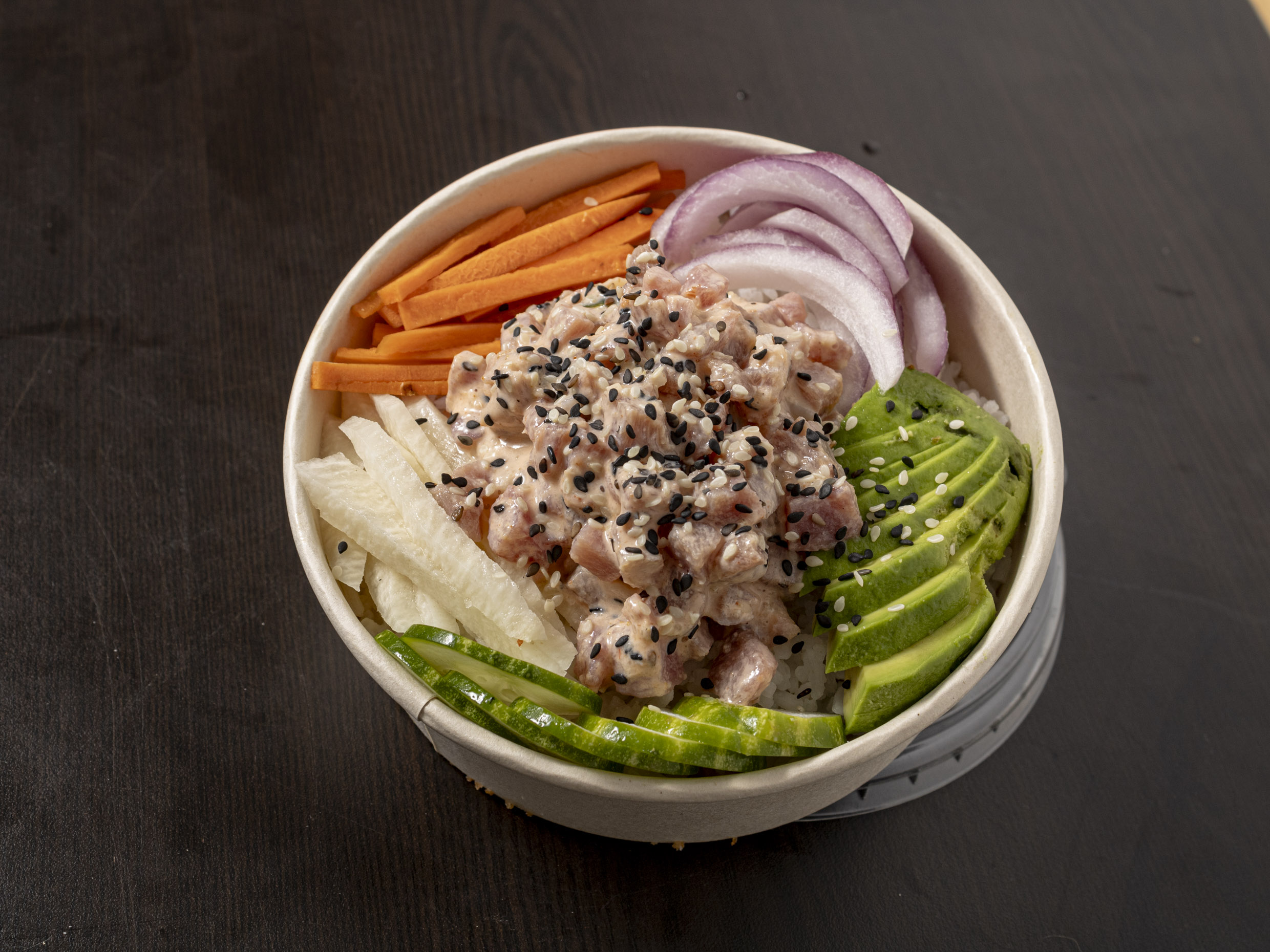 Base de suave arroz blanco complementado con crujiente y fresco pepino, rábano, col morada curtida, frijol de soya, cebolla morada y suave aguacate. Coronado con la proteína de tu elección marinada con preparado de la casa.