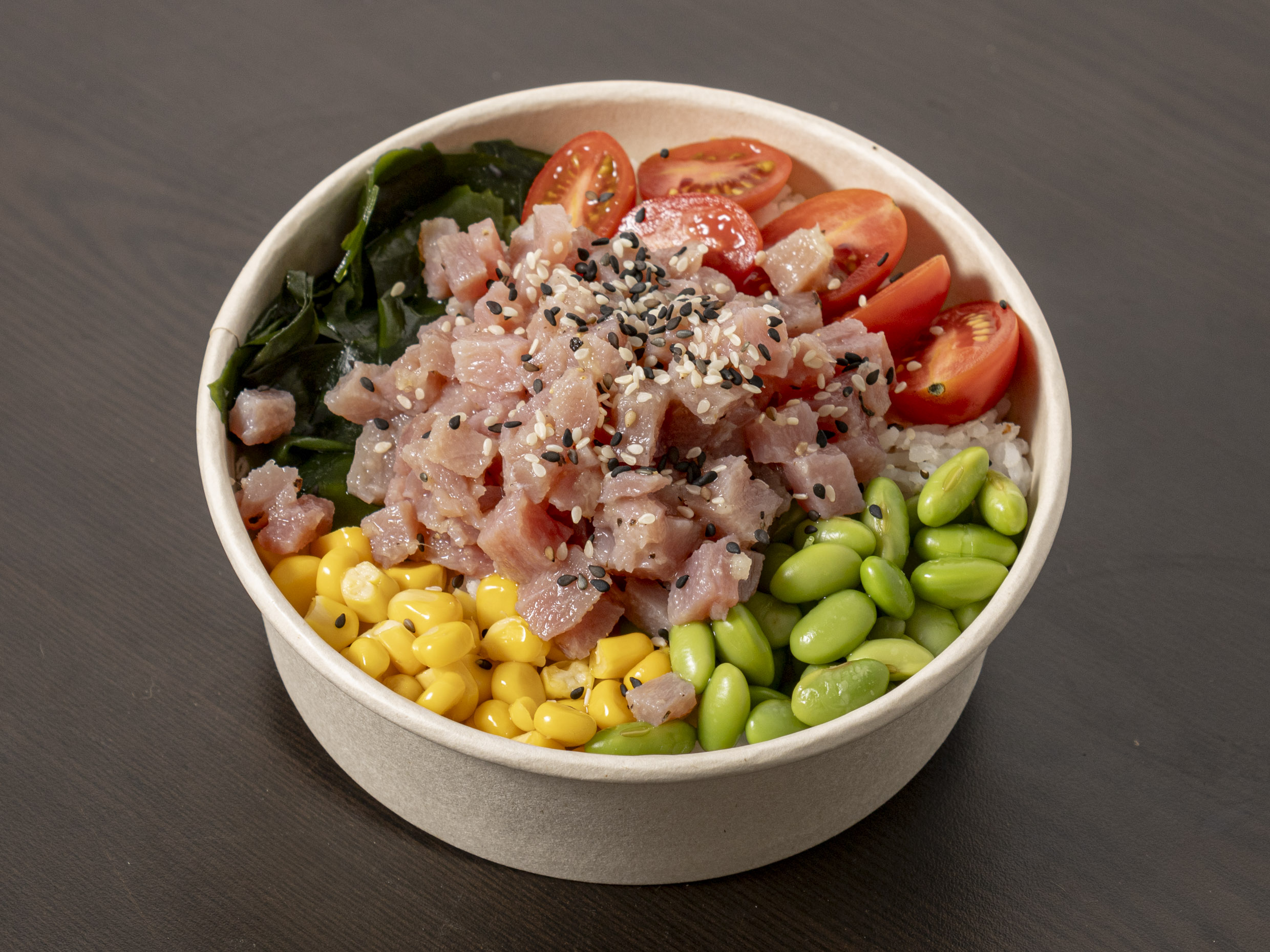 Base de suave arroz al vapor complementado con fresca alga wakame, jitomate cherry, edamame crujiente y granos de elote amarillo. Coronado con la proteína de tu elección bañada en un marinado de piña de la casa.