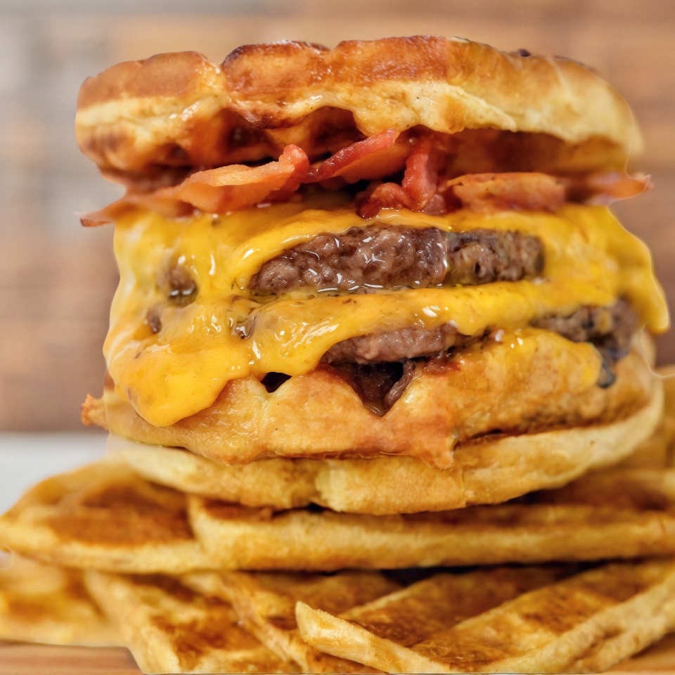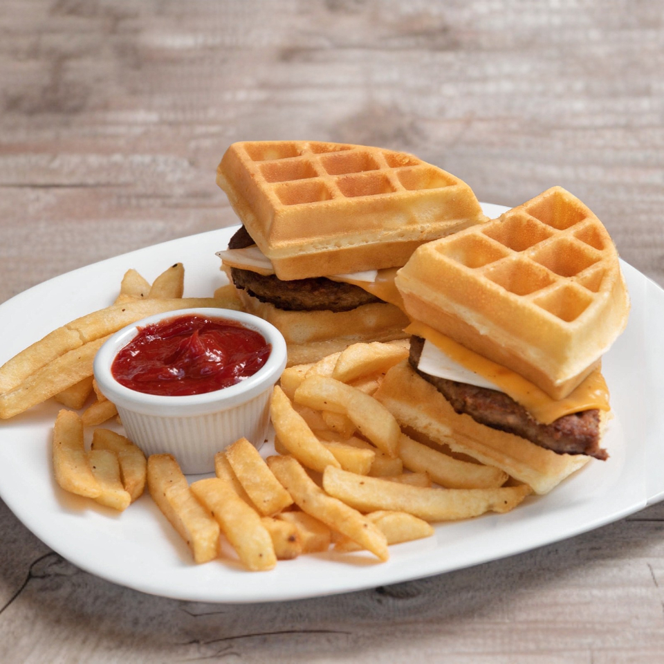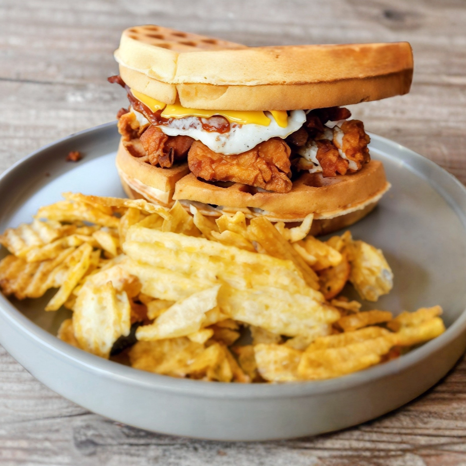 Waffle Sandwich con Pollo Frito, Tocino, Queso Americano y Queso Cheddar.