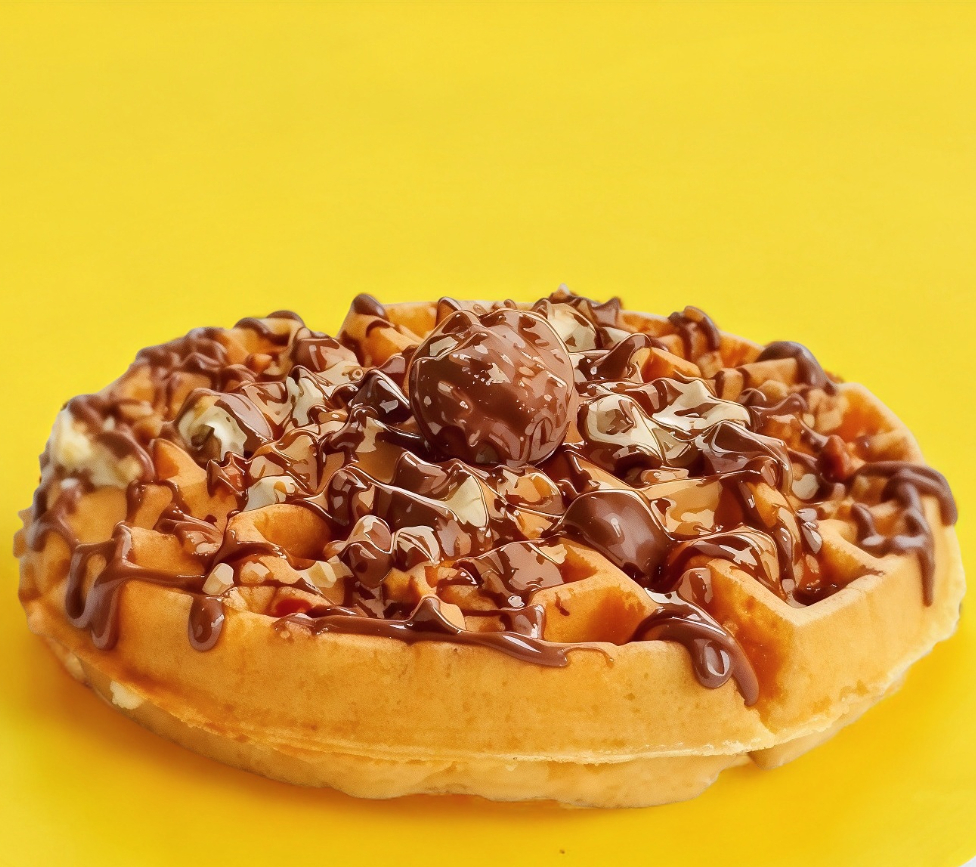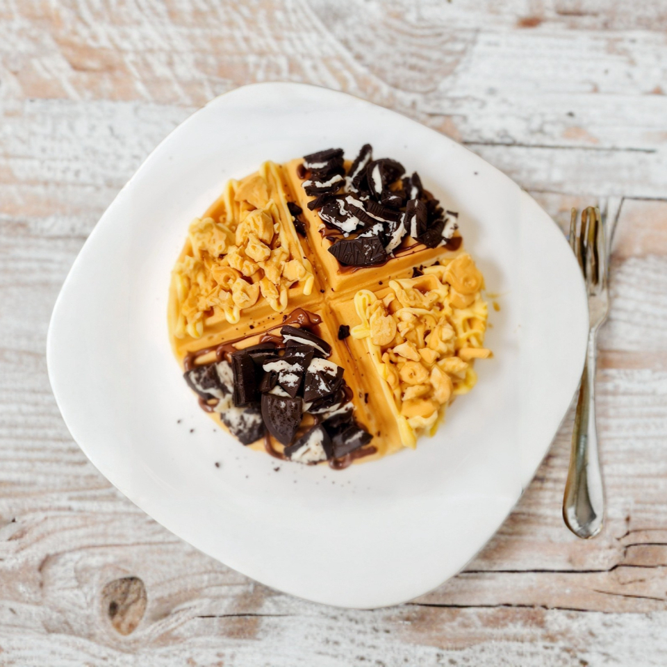 Waffle con Nutella-Oreo y chocolate Blanco-Galleta de Vainilla.