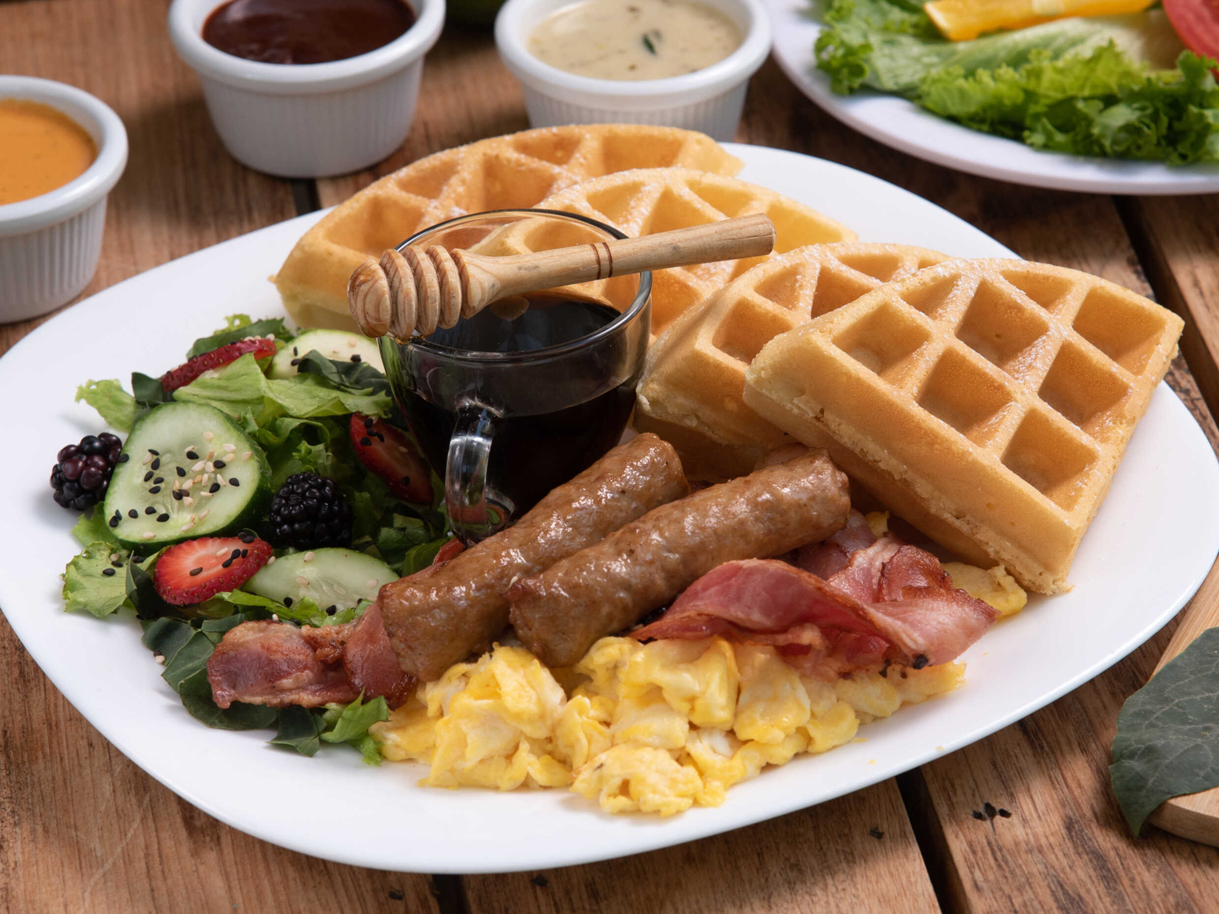 Producto personal ;(Conte: 8x8 pulgadas).Waffle con Huevos Revueltos, Tocino, Salchicha Americana y Ensalada (Jitomate ,cebolla ,pepino )