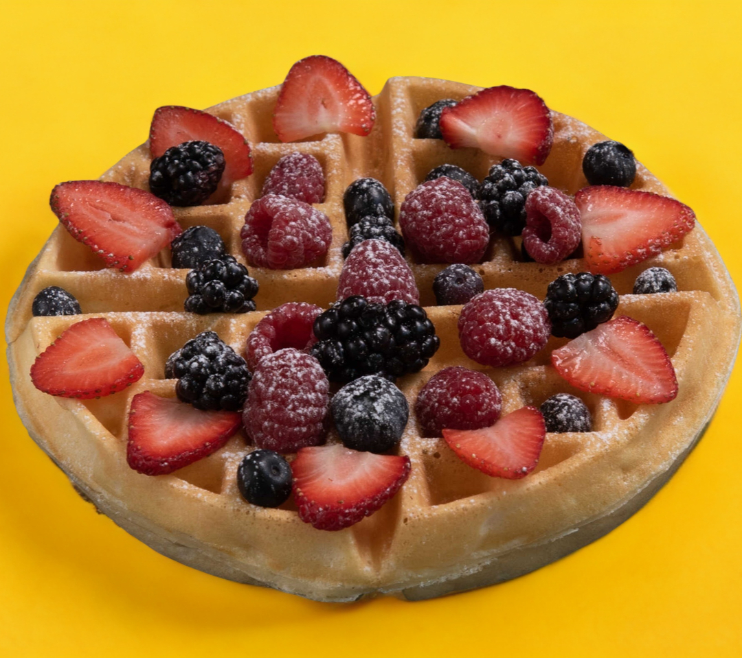 Waffle con Frutos rojos, Azúcar Glass y Jarabe de maple.
