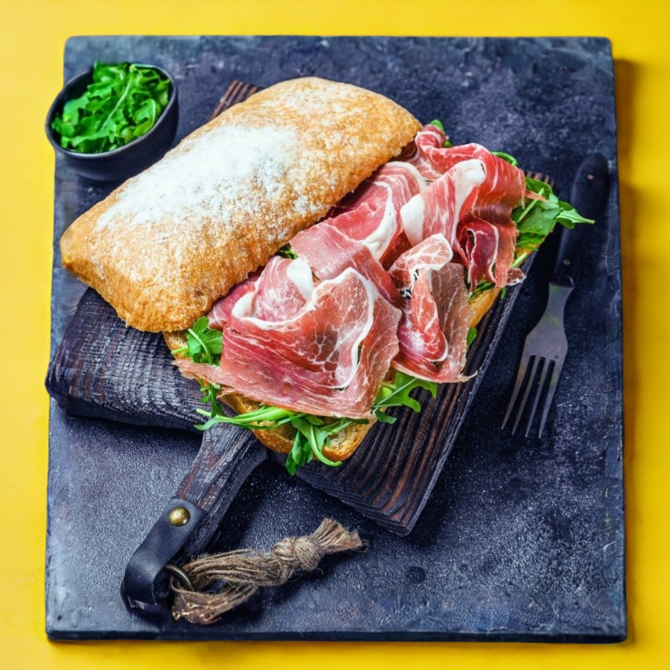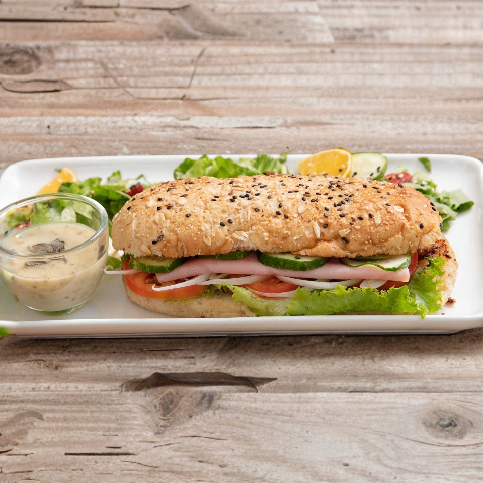Jamón de Pavo, Queso Manchego y Americano, Lechuga, Aguacate, Jitomate y Cebolla. Acompañado de ensalada.