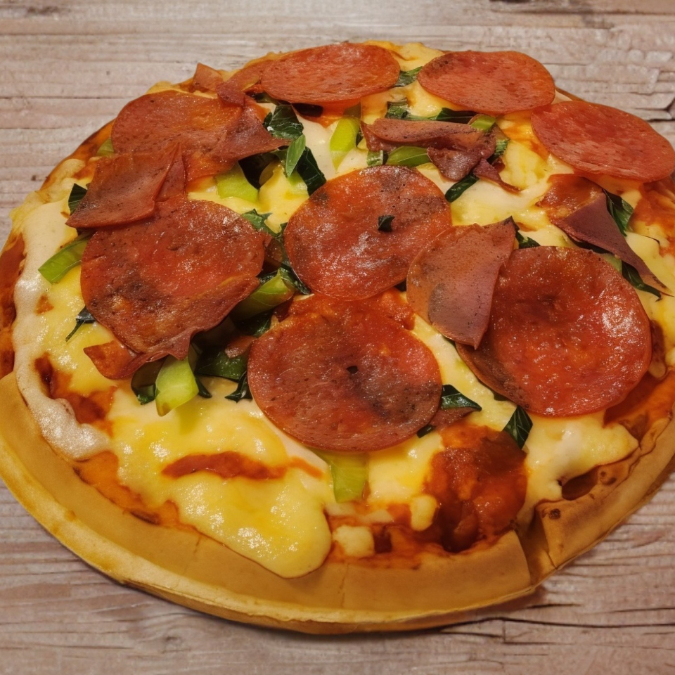 Waffle con Queso Mozzarella, Pepperoni y Pimiento Verde.