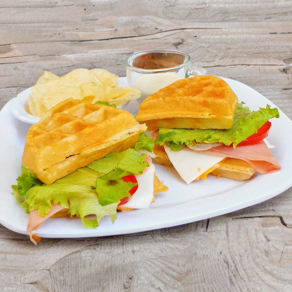 Waffle con Jamón de Pavo, Queso Manchego, Queso Americano, Jitomate, Cebolla, Lechuga y Aguacate.