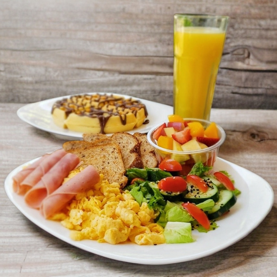Jamon de Pavo*1 + Ensalada*1 + Pan integral de caja *1 + 1 Waffle de Nutella*1 + 1 Bowl de fruta*1 + Huevos Revueltos*1 + Agua de Horchata 16 oz*1