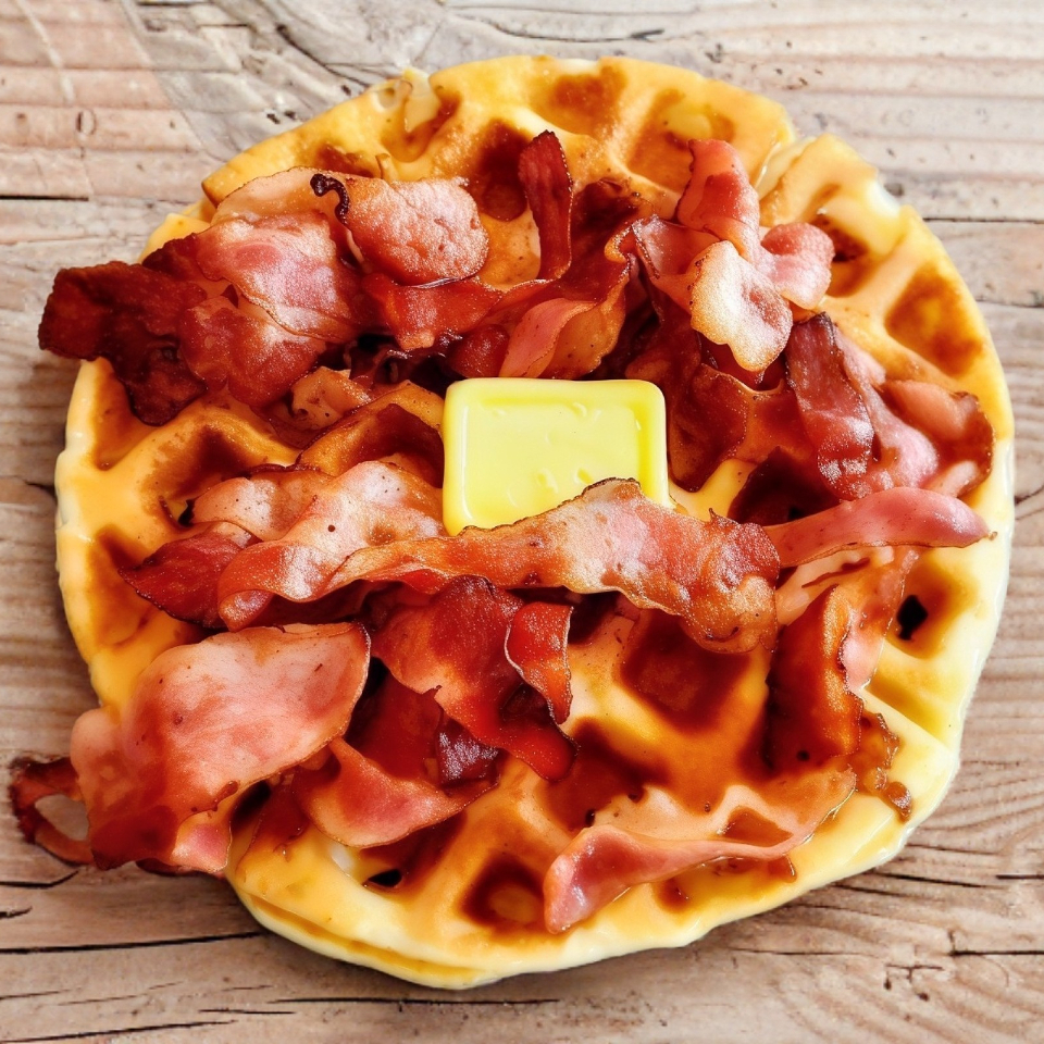 Waffle con trozos de ate de guayaba, cubierto en queso cheddar, tocino y Mapple.