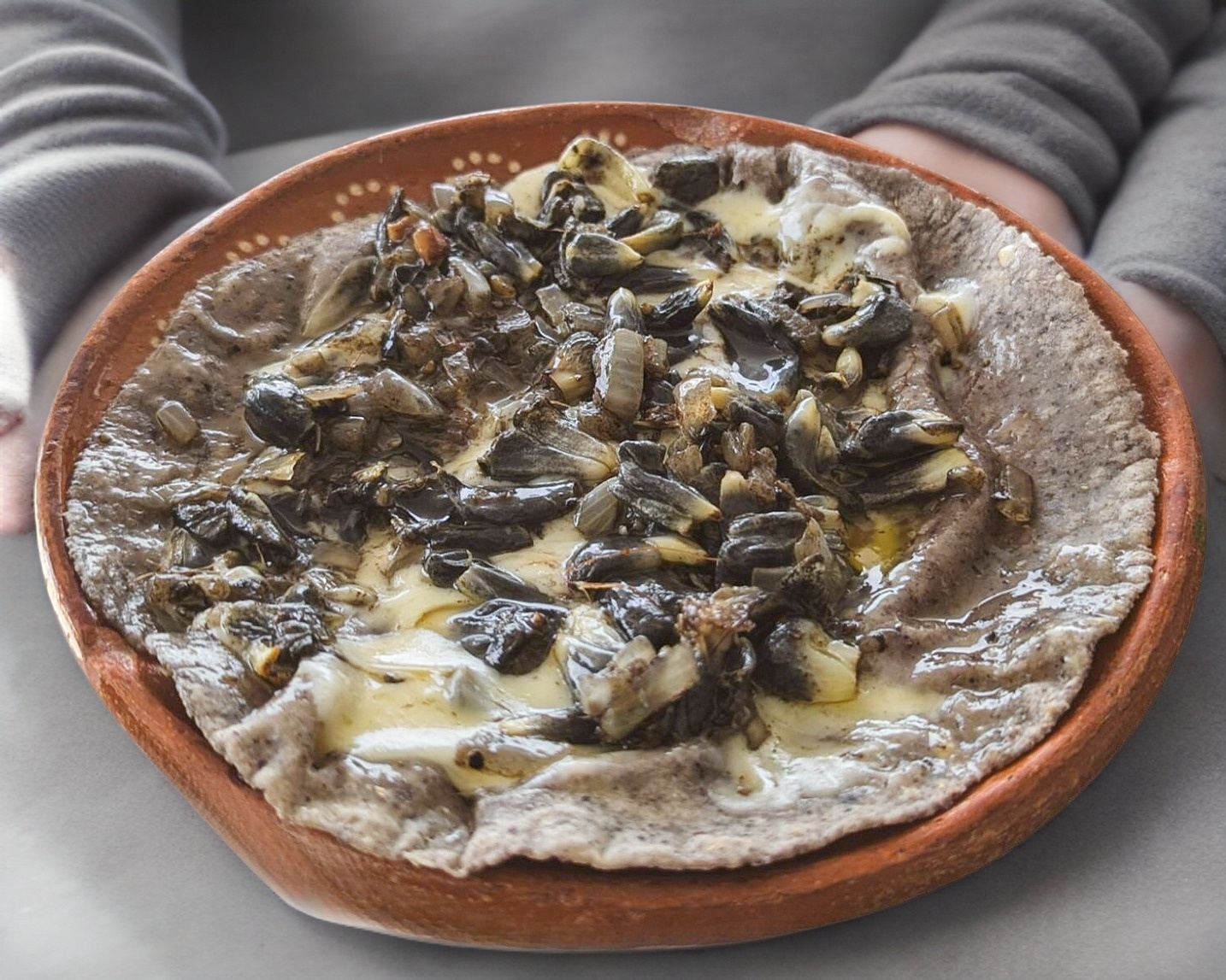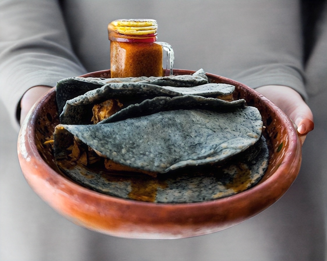 Tortilla frita bañada en tradicional recado negro, carne de cerdo y pepita de calabaza.