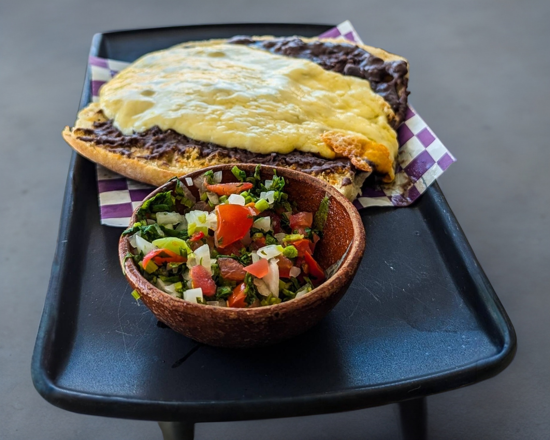1 Pieza de telera doradita untada de frijoles negros y queso gratinado