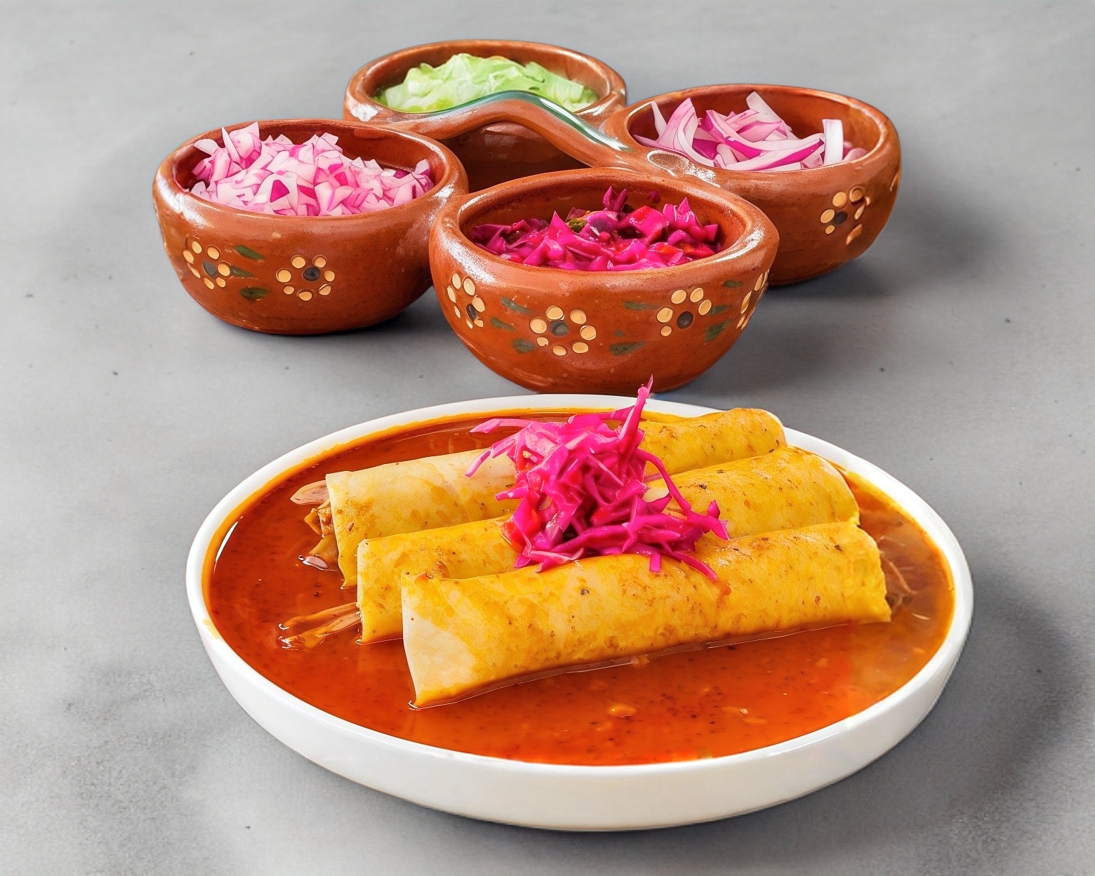 3 Tacos enrollados, bañados en delicioso jugo de cochinita, rellenos de cochinita.